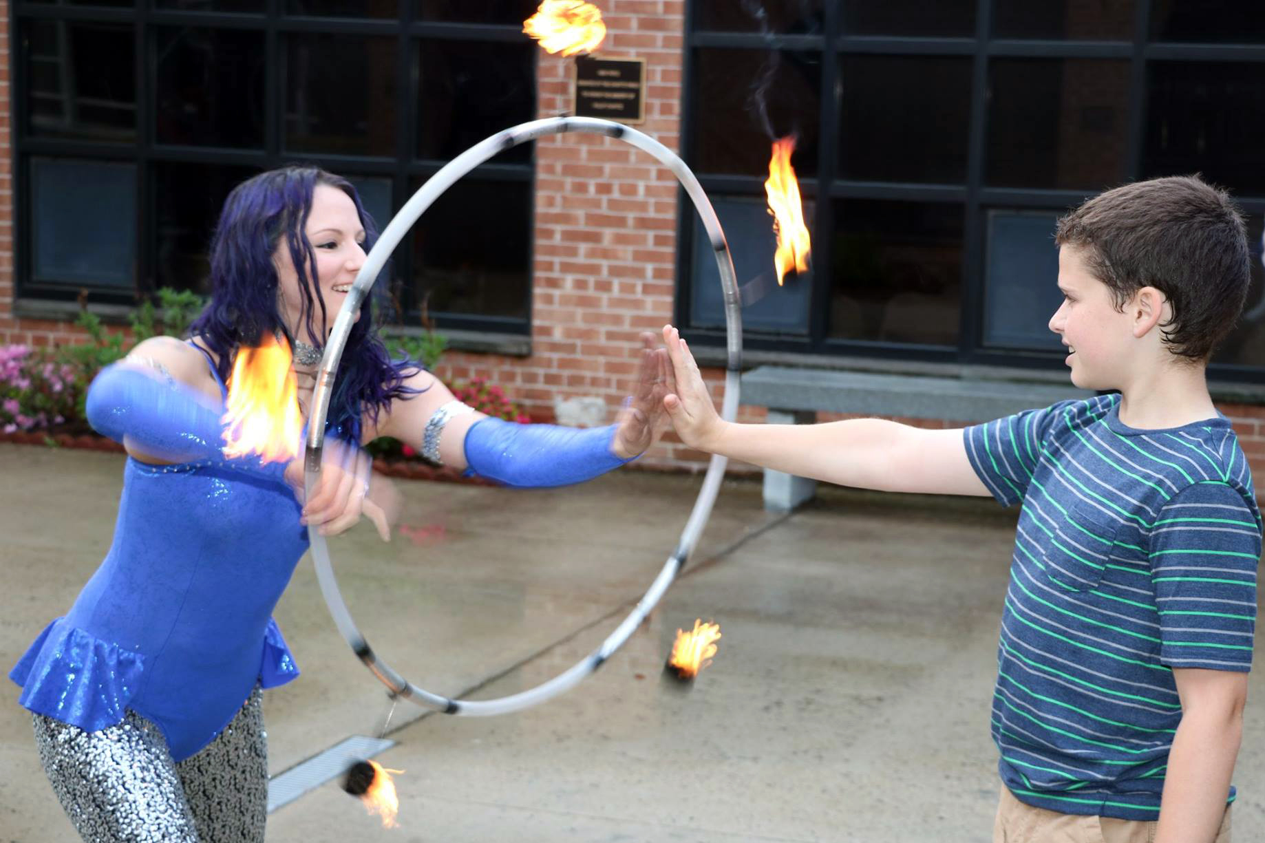 Along with fire performance, throughout the years I trained in other circus arts. I learned sideshow acts such as blockhead, walking on broken glass, eating a lightbulb, climbing a ladder made of sharp machetes while barefoot, and laying on a bed of nails. I often piggyback around 200 lb guys while walking on broken glass, have people stand on my while laying on the bed of nails, and paint portraits of people with a paintbrush shoved 6 inches into my nose. I also perform stilt walking and make costumes for stilts, perform LED hula hoop, poi, and Isis wings, perform aerial Lyra and hammock, and I am even a Mermaid donning a 50lb realistic silicone Mermaid tail while gracefully swimming underwater. I can break a target out of your mouth with a bullwhip as well. I also offer circus playshops where we lay out a variety of different circus and flow props such as juggling scarves, juggling balls, spinning plates, balance board, diabolo, devil sticks, hula hoops, poi, silk fans, and so on and let kids, teens, and adults play while also offering demonstrations and instruction.