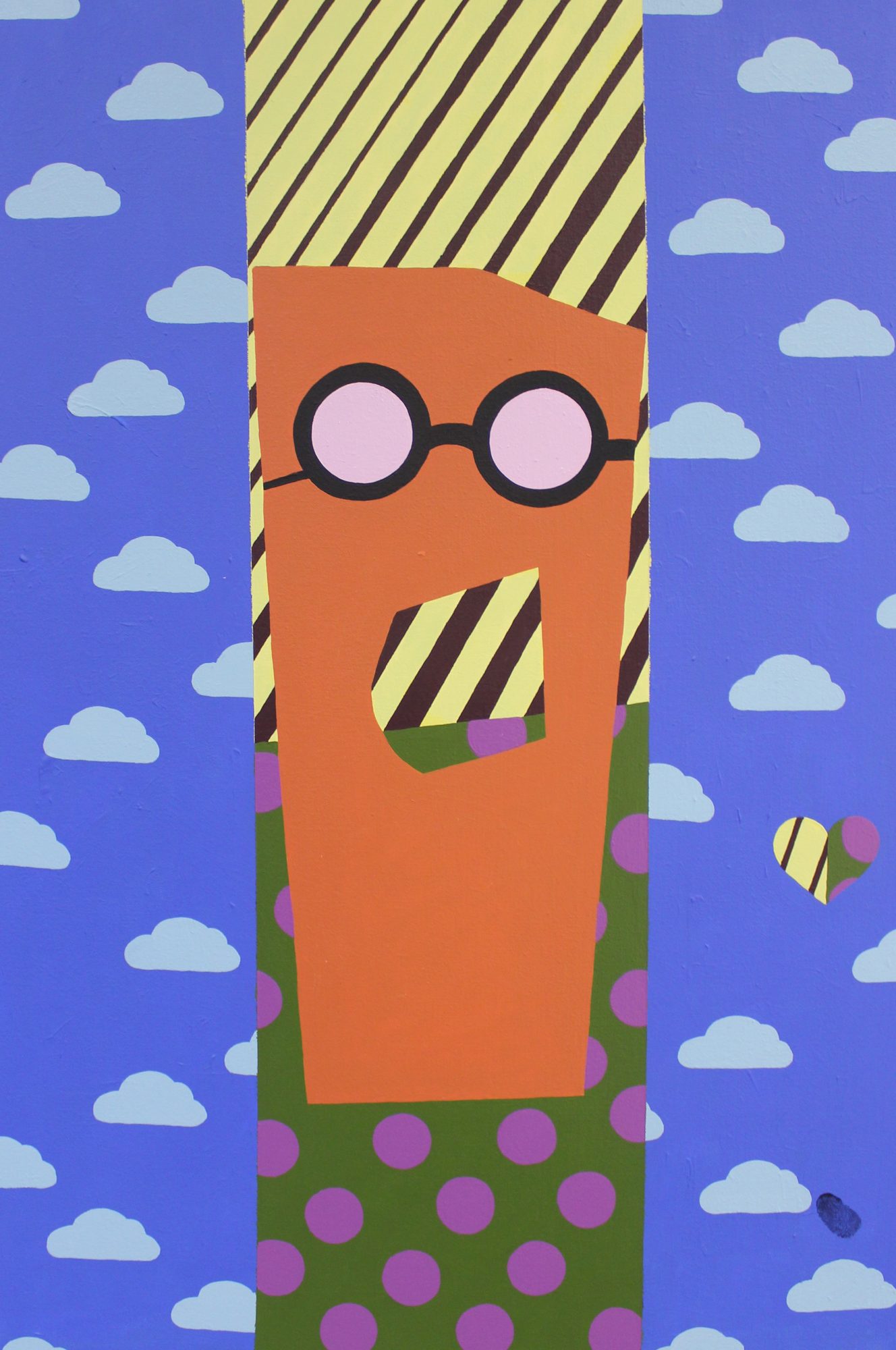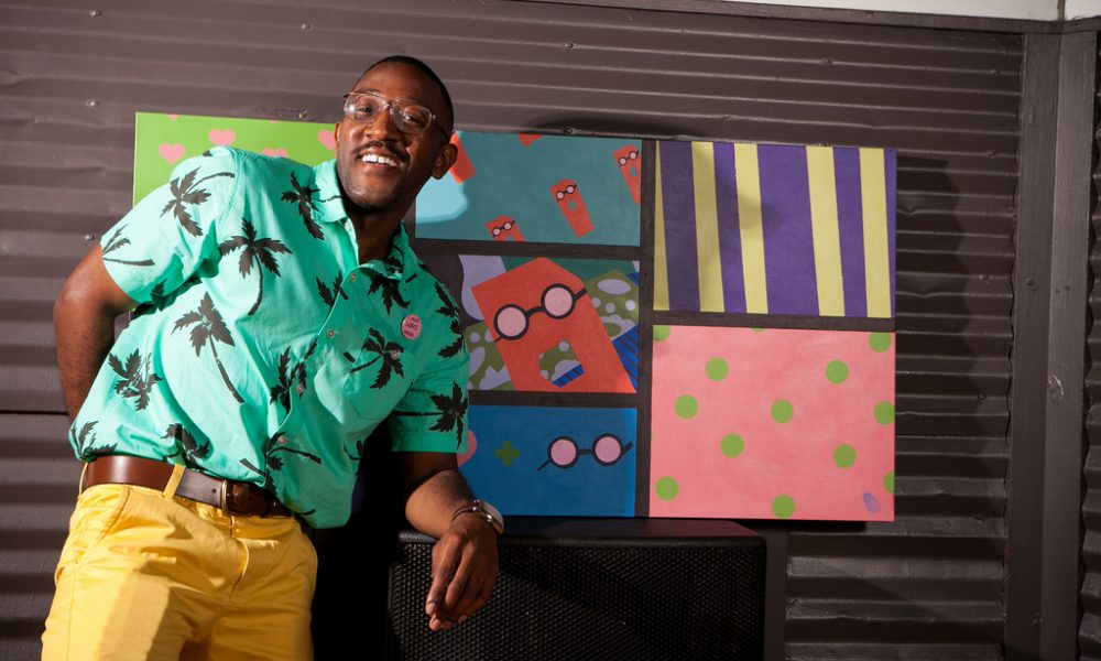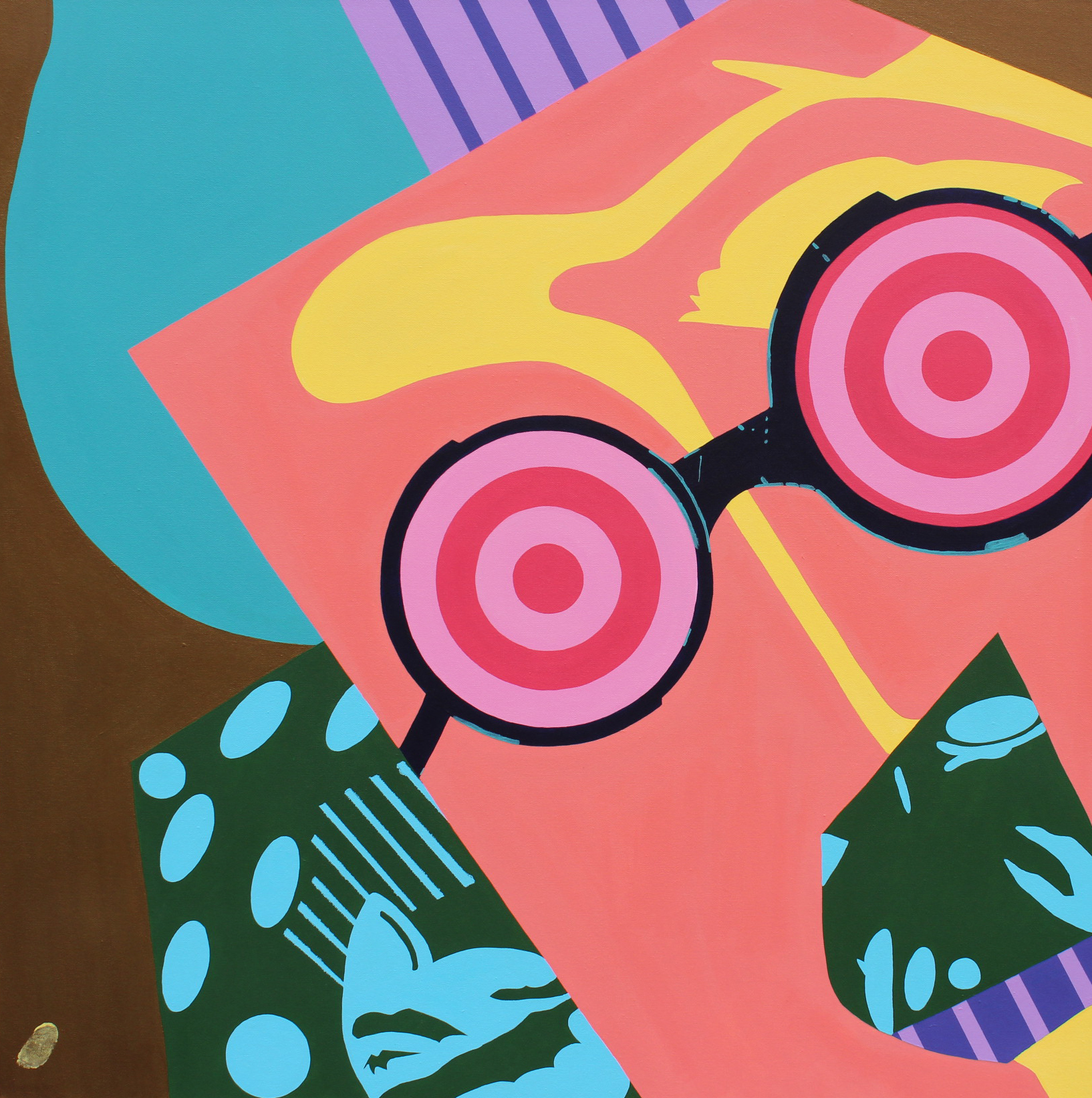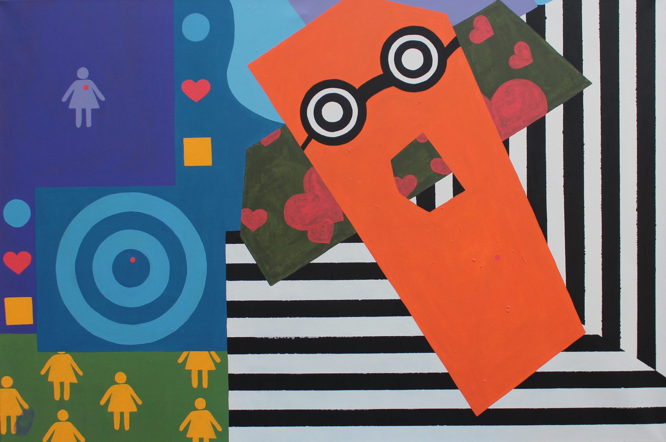 Growing up, I was playfully teased for looking nerdy and was consistently called Steve Urkel (I still get called Steve Urkel to this day). At that time I was deeply affected by it though I always laughed it off. I wanted to be part of the “cool crew” in school. As an adult, I look back at those times and realize that I should have embraced who I was and still am: a creative NERD. Today, that is the foundation of my artistic brand and my ongoing art series Nerd Meets World. Nerd Meets World abstractly follows the life of Spencer Q. Ward who is the personification of the zany nerd, with large, thick coke bottle glasses, outrageous polka dotted trousers and audacious striped sweaters. Each painting catches Spencer in the act of secretly professing his unrequited love for his best friend who has conveniently “friend zoned” him. This makes for a never dull moment in each painting. As a result, the viewer will see a propensity towards brilliantly bold blasts of color symbolizing the thrill from love and life. I ask my viewers to warmly embrace this ludicrous love lorn nerd through his woven web of romantic tales between him, a girl and the World.