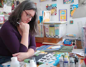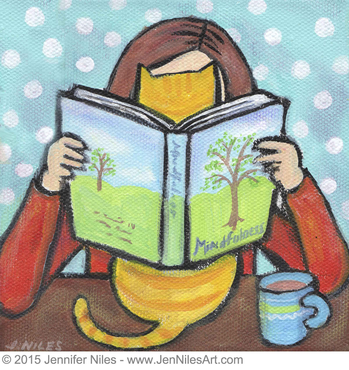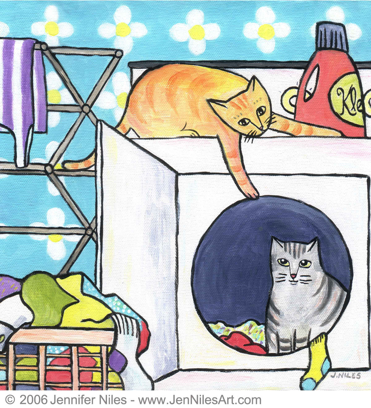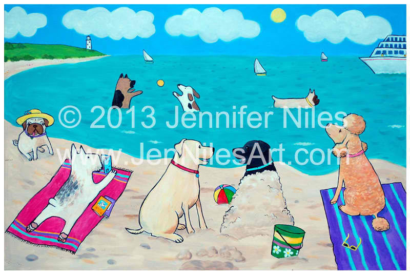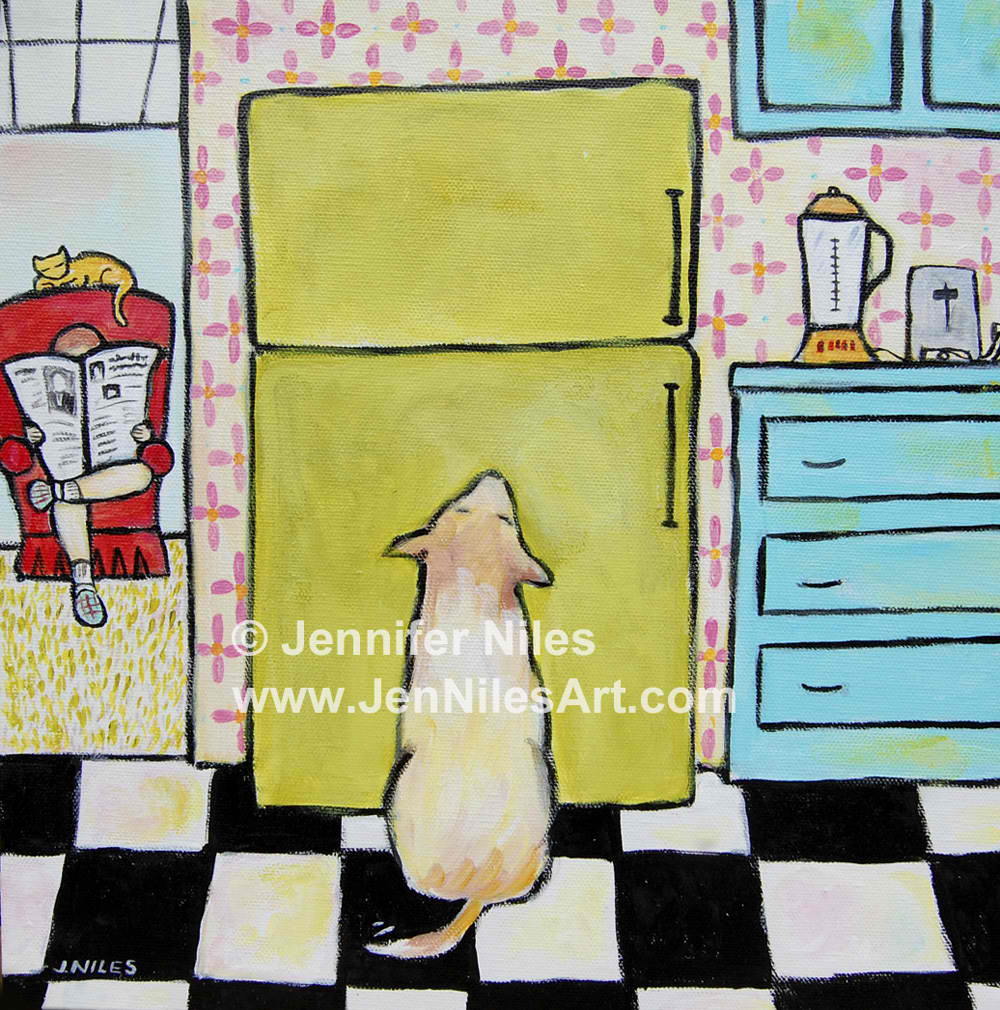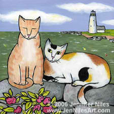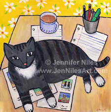 In 2001 I began experimenting with acrylics, inspired by the comical antics and effortless elegance of my two cats, PK and Nellie. From there, I developed a recognizable, whimsical style usually featuring bold color and cheerful subjects from everyday life. Whether it is my cats, my son or my surroundings here at home in New England, I never fail to find inspiration.