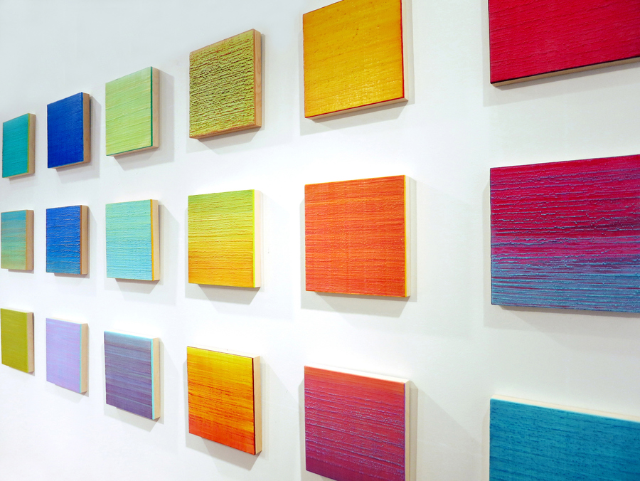 I paint small-scale color fields and reductive geometric abstractions. My color is saturated, my surfaces richly textural. It’s only partly tongues in cheek that I call my work “lush minimalism.” My long-running current series, “Silk Road,” was initially inspired by the iridescence of a two-tone silk fabric but quickly evolved into an exploration of luminosity on and under the surface.