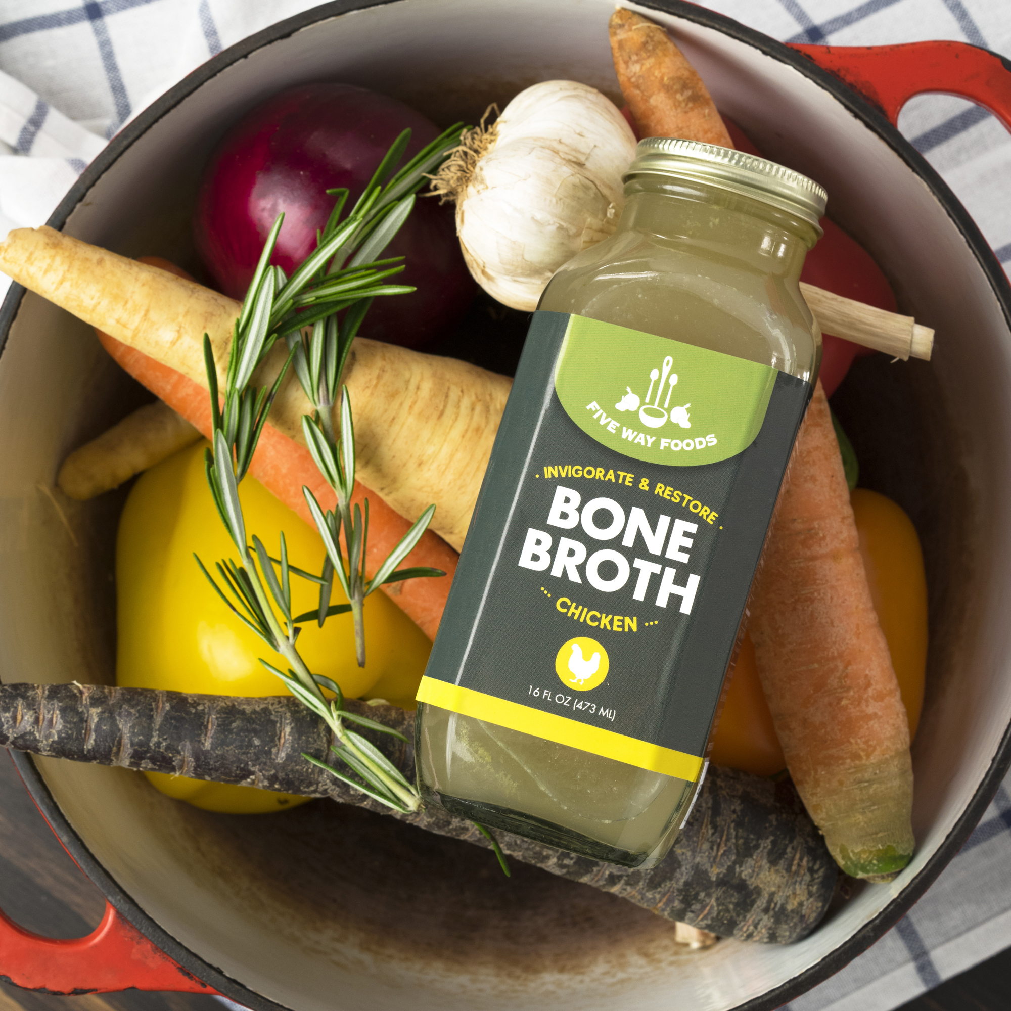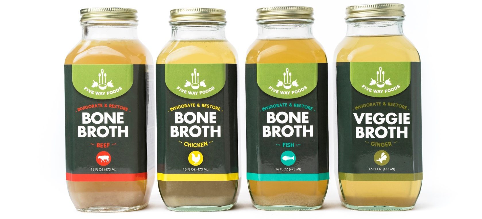 Five Way Foods is known for our all-natural, delicious and local-sourced bone broths, made from scratch with real vegetables, herbs, and bones. What really sets us apart is our fresh refrigerated vegetable, meat and fish bone broths for cooking and drinking. Our Broths are crafted with real-bones and ingredients sourced from New England farms (and ocean) which are slow simmered for long periods of time for maximum collagen, flavor and taste. All of our broths are clean label with no soy, gluten, dairy, sugar or preservatives.