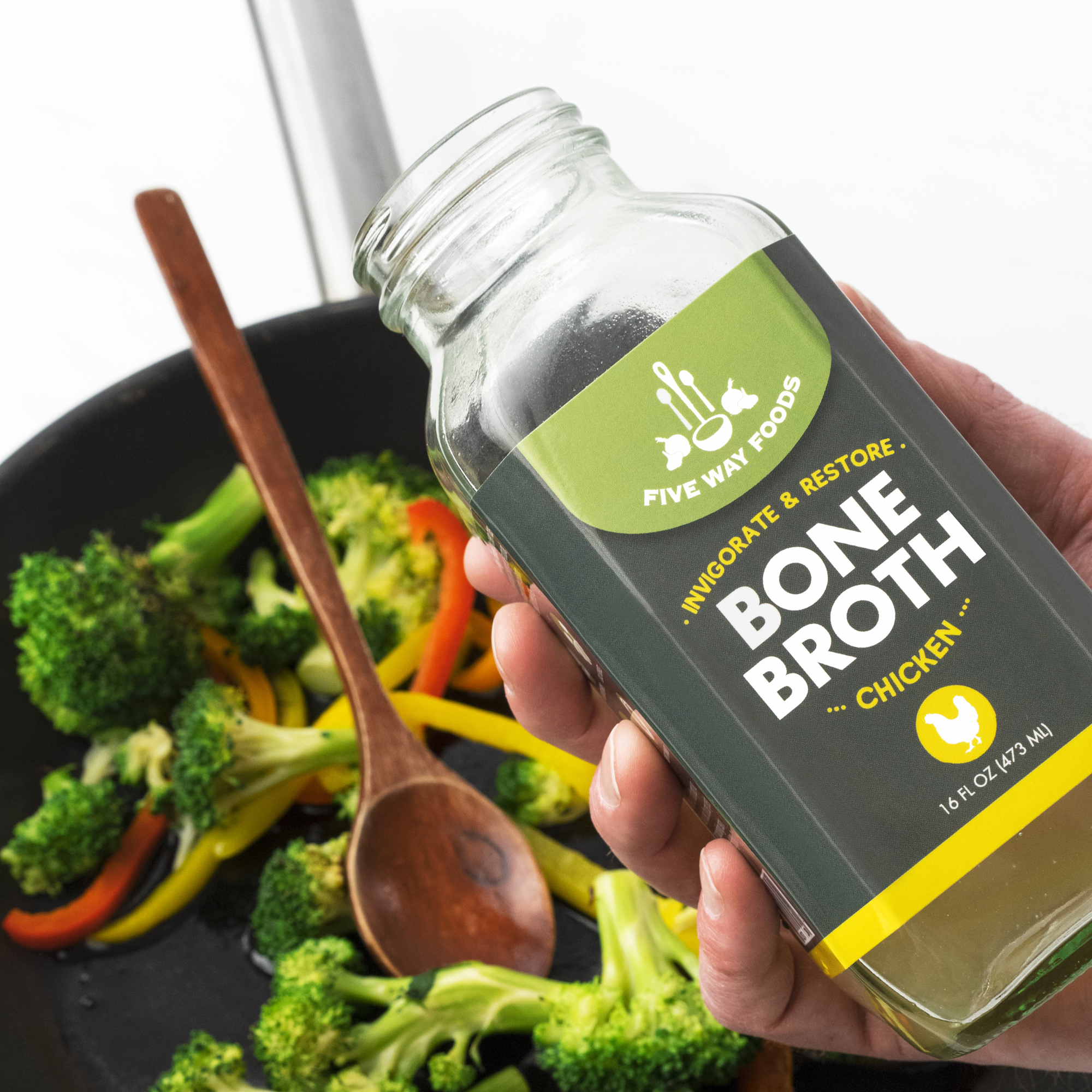 Once I had perfected my recipes and finalized the packaging, in the winter of 2017 I took the Five Way Foods Chicken and Veggie broths to farmers markets. My expectation was to sell a few bottles and to my great surprise I sold everything. Over the next six months, I continued to sell chicken & veggie bone broths at farmers market. During that time, I received a lot of customer feedback on how they use their broths, which got me to my company name – Five Way Foods!