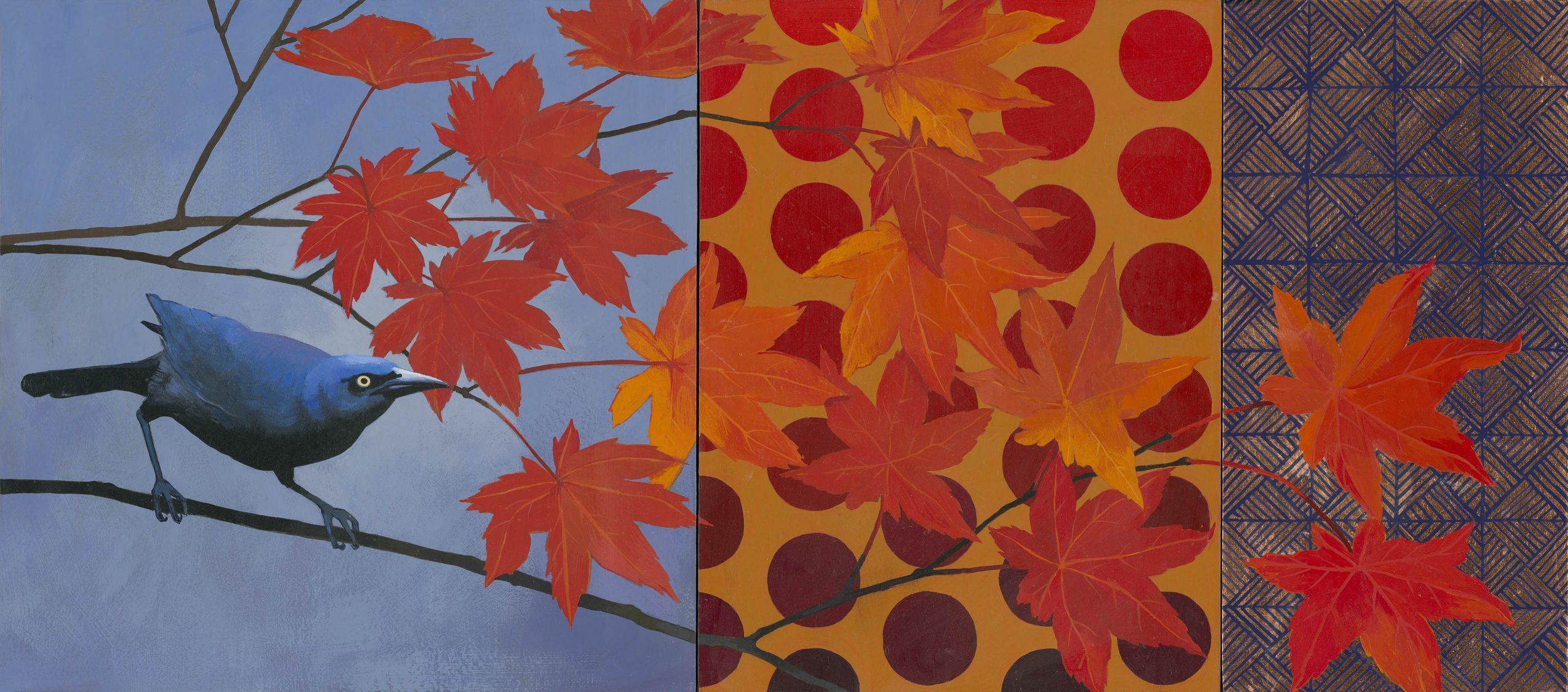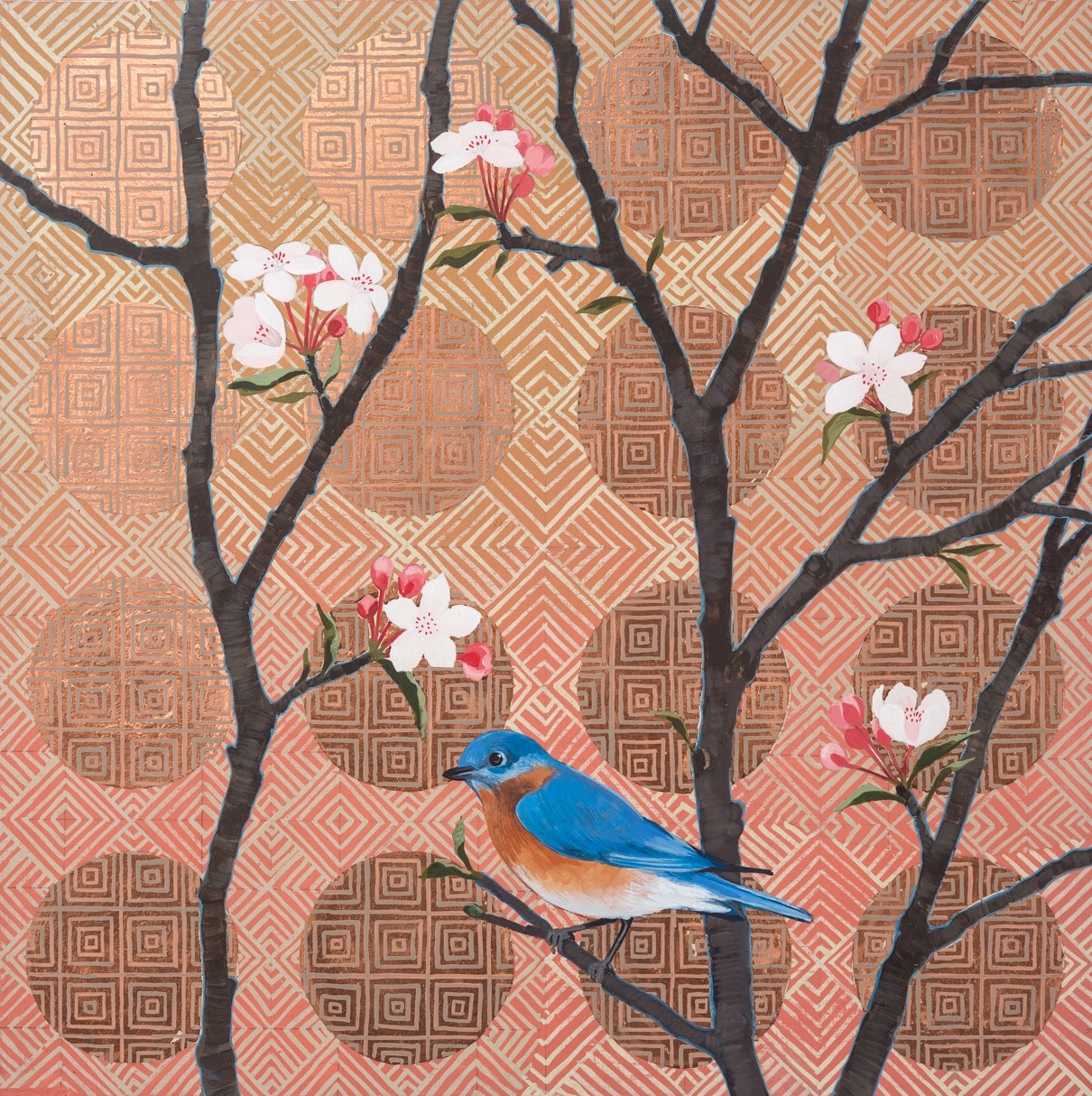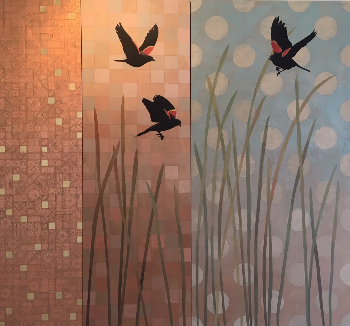 I am a painter, working primarily with Acrylics and Metal Leaf. I love nature, so it is featured in all of my work, from small birds and animals, to interesting plants, flowers and landscapes. In the past two years I have been making white line woodblock prints, which is a thoroughly American art form developed in Province town about a hundred years ago. It is a meticulous, repetitive, and labor-intensive art form that I find very satisfying. In much of my work I include geometric patterning, which is also repetitive and labor intensive, so I guess I have something for that kind of work. The repetition creates a meditative state, which I find relaxing, and contemplative.