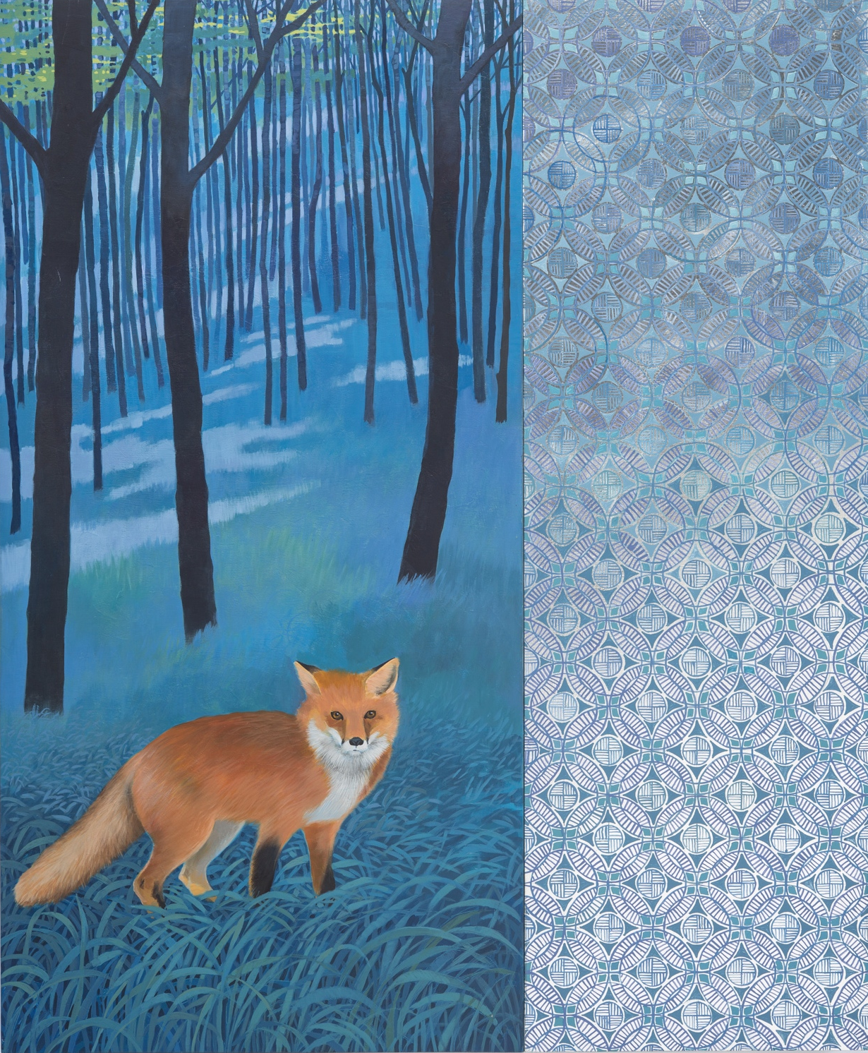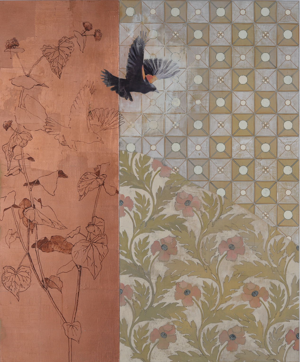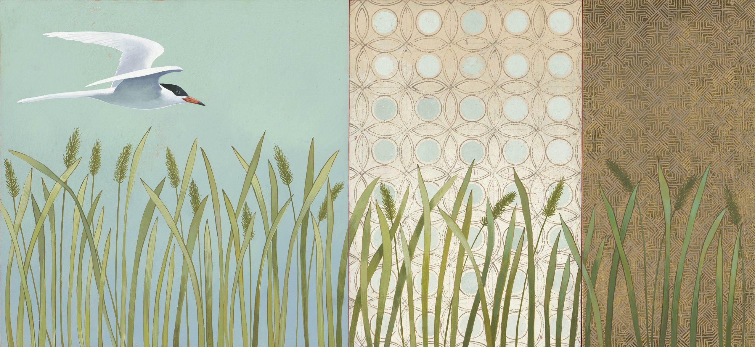 I am a painter, working primarily with Acrylics and Metal Leaf. I love nature, so it is featured in all of my work, from small birds and animals, to interesting plants, flowers and landscapes. In the past two years I have been making white line woodblock prints, which is a thoroughly American art form developed in Province town about a hundred years ago. It is a meticulous, repetitive, and labor-intensive art form that I find very satisfying. In much of my work I include geometric patterning, which is also repetitive and labor intensive, so I guess I have something for that kind of work. The repetition creates a meditative state, which I find relaxing, and contemplative.