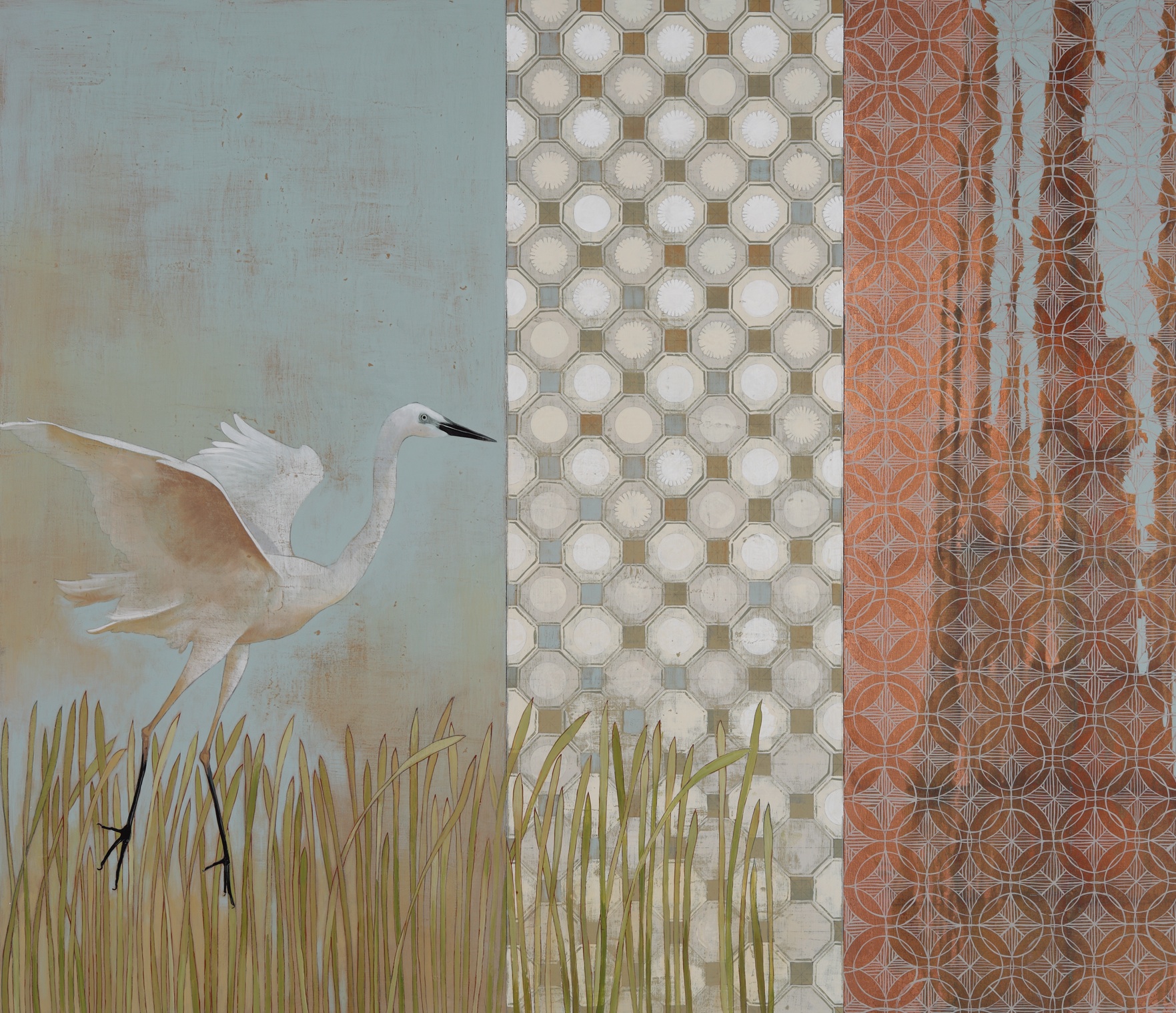 Recently I was doing some teaching and demonstrating some of my techniques and found that I have about 8 steps in creating my paintings, before I begin painting the subject of the work. Starting from wood panels, I prime with house paint, then add layers of paint, texture and geometry, then get out my fine brushes to do the detail work. I paint on wood, because canvas has too much bounce and is not durable enough for some of the sanding and scraping that happens in the process of creation.