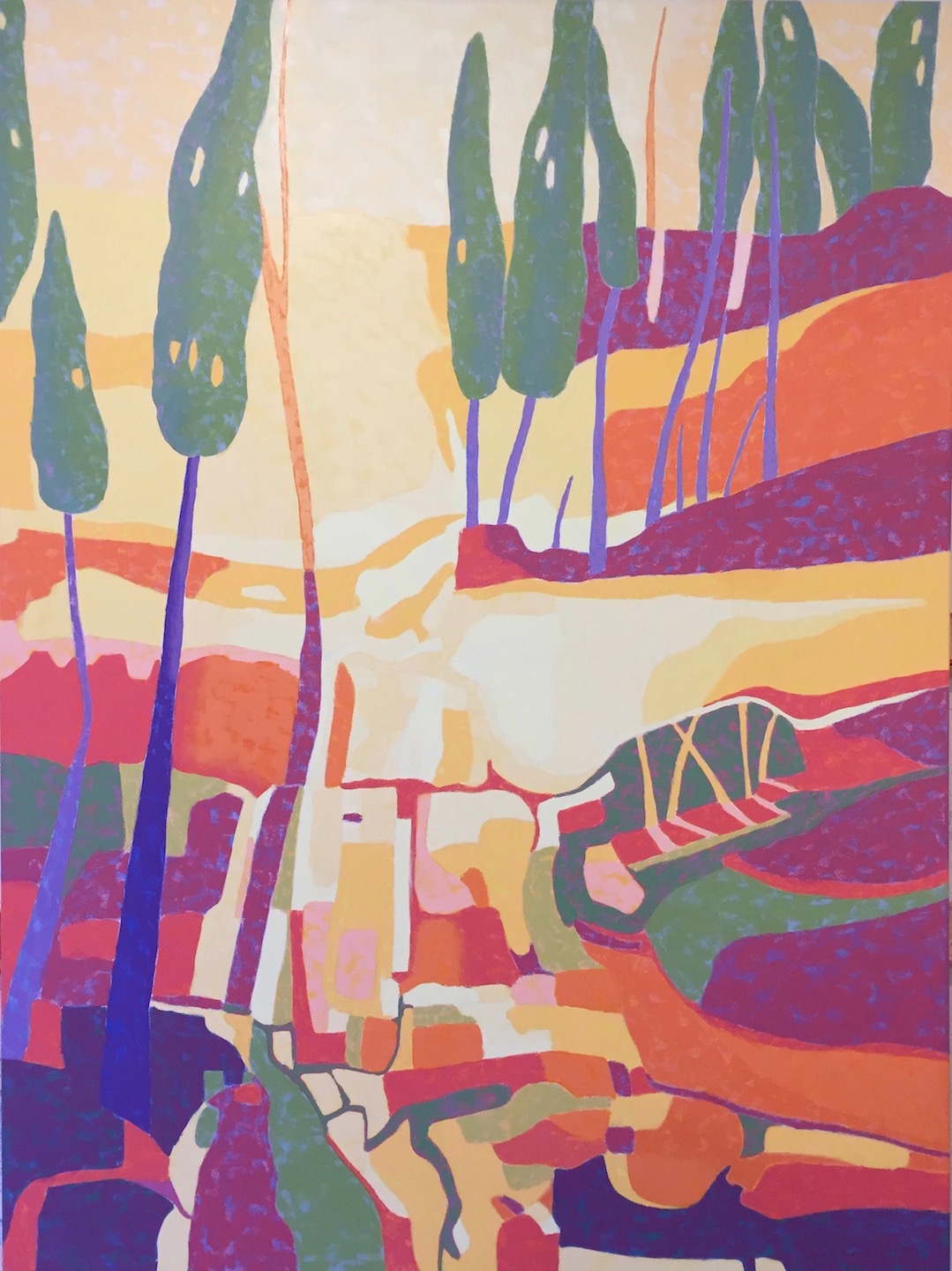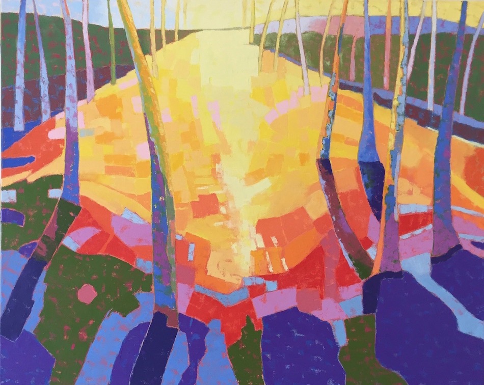 In my work, I like to let each layer of paint dry before applying another layer. In this way, and using the palette knife, I allow the application process to produce a broken color effect so that each layer of paint – each color in each layer – is seen in the finished piece. The human eye will naturally see these layers and bring them together, which is that abstract part of me, often going back and forth from more representational subjects to more abstraction. It is a process of addition and reduction when utilizing the palette knife that I enjoy. In my current paintings, which tend much more toward abstraction, I use brushes more on my first few layers and then play with the palette knife to create more texture and expressiveness in form, allowing previous layers of color to show through.