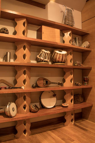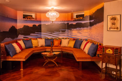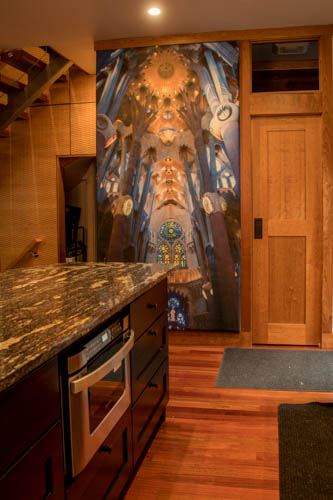 Repurposed church glass has been integrated into door transoms, newel posts and a new Koi pond. Wall sized murals were printed on fabric, used for sound absorption and the surround of built in seating. The integration of art in living and working environments adds visual interest and reinforces the stories of the lives of my clients.