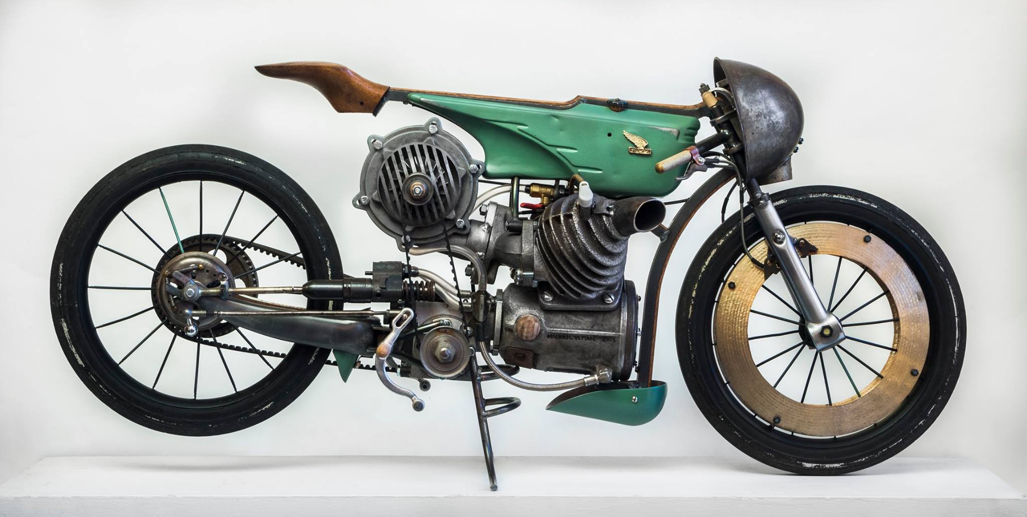 I make a lot of vehicles with wild engines, the engine is mostly the prominent part. Motorcycles, hotrods, speedboats, plains, etc. To make a static sculpture that evokes sound, power and movement is the goal.
