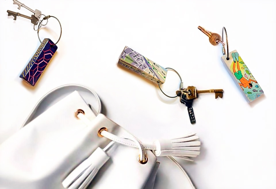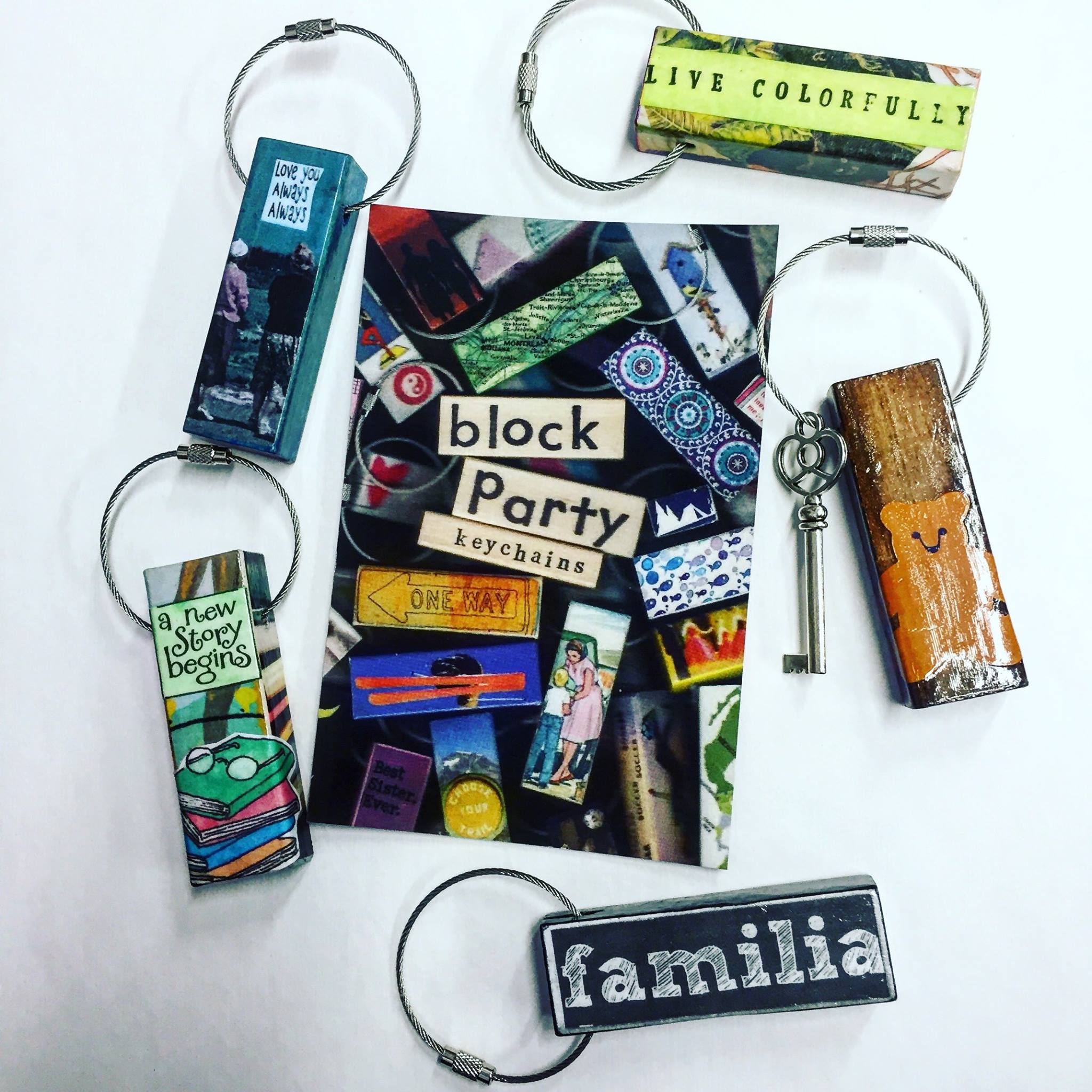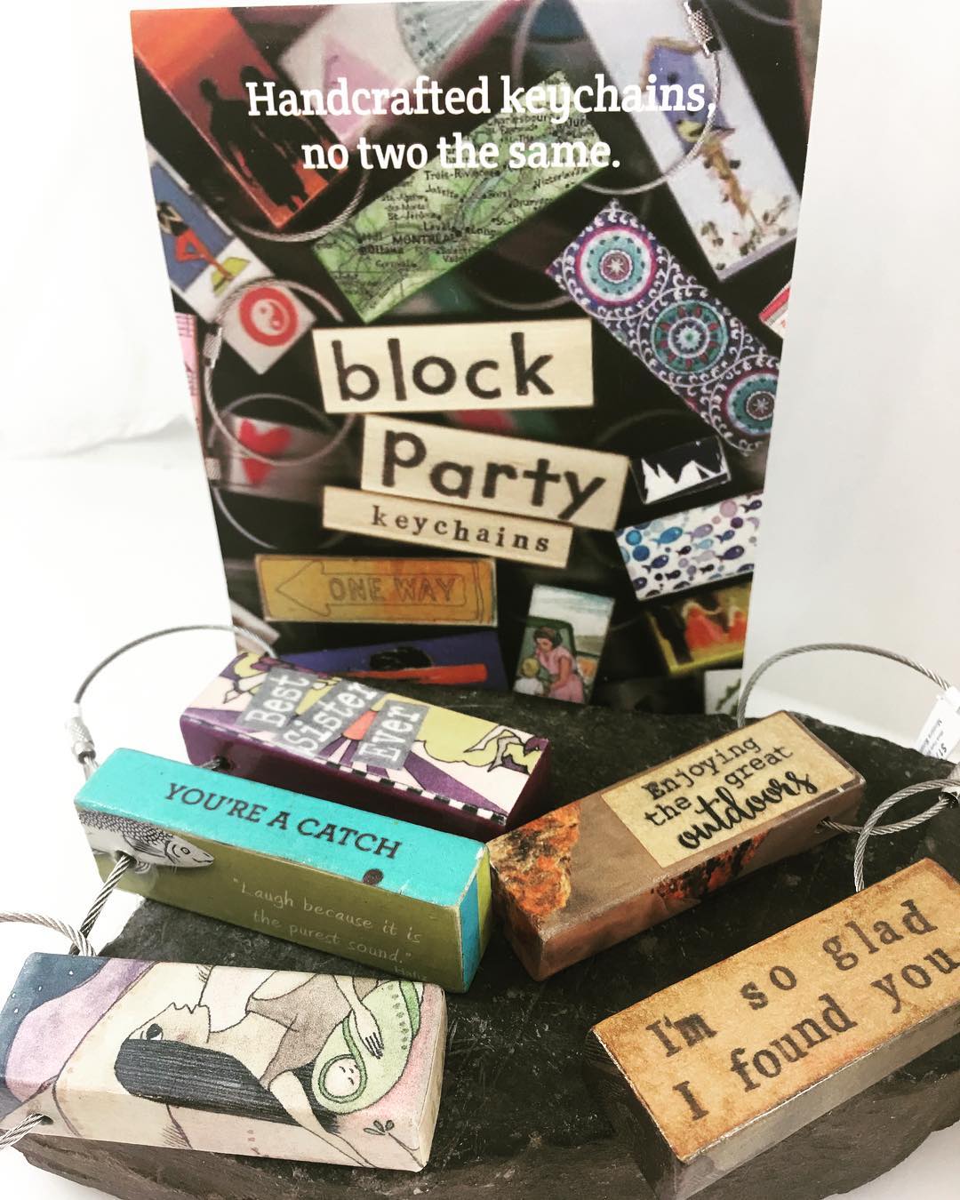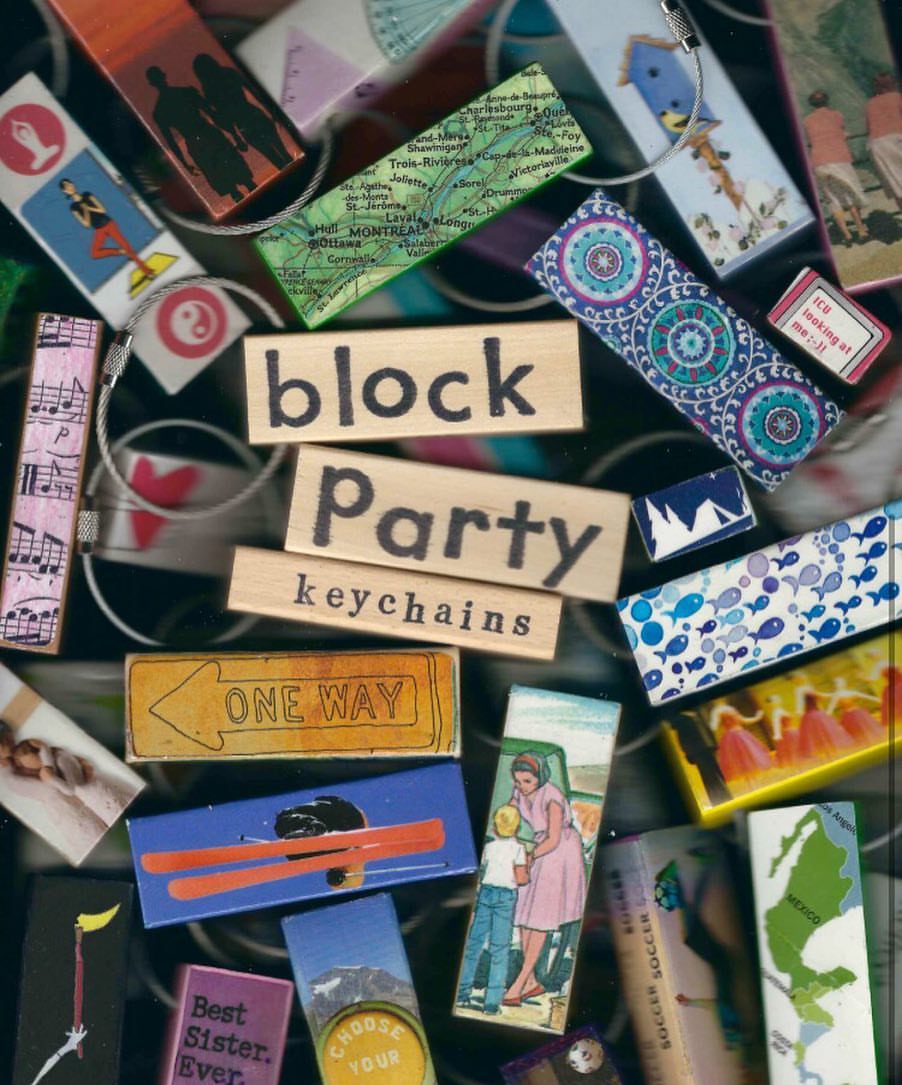 Block Party keychains are handmade (by me!) in the Boston area. I drill a hole into a wooden block (1x3x½ inch) (like those used in the tumbling tower game), decorate them (with magazine clippings, maps, pyrography, stamps and more), mod podge all faces, put a keyring through the hole, and spray them with a finish. They’re lightweight, big enough to find in your purse but small enough to fit in your hand. No two are exactly alike, and the range of style is endless, which means there is something for everyone – the athlete, the parent, the teacher, the yogi, the musician, the activist, the snow bunny, beach bum, the outdoorsy adventurer…