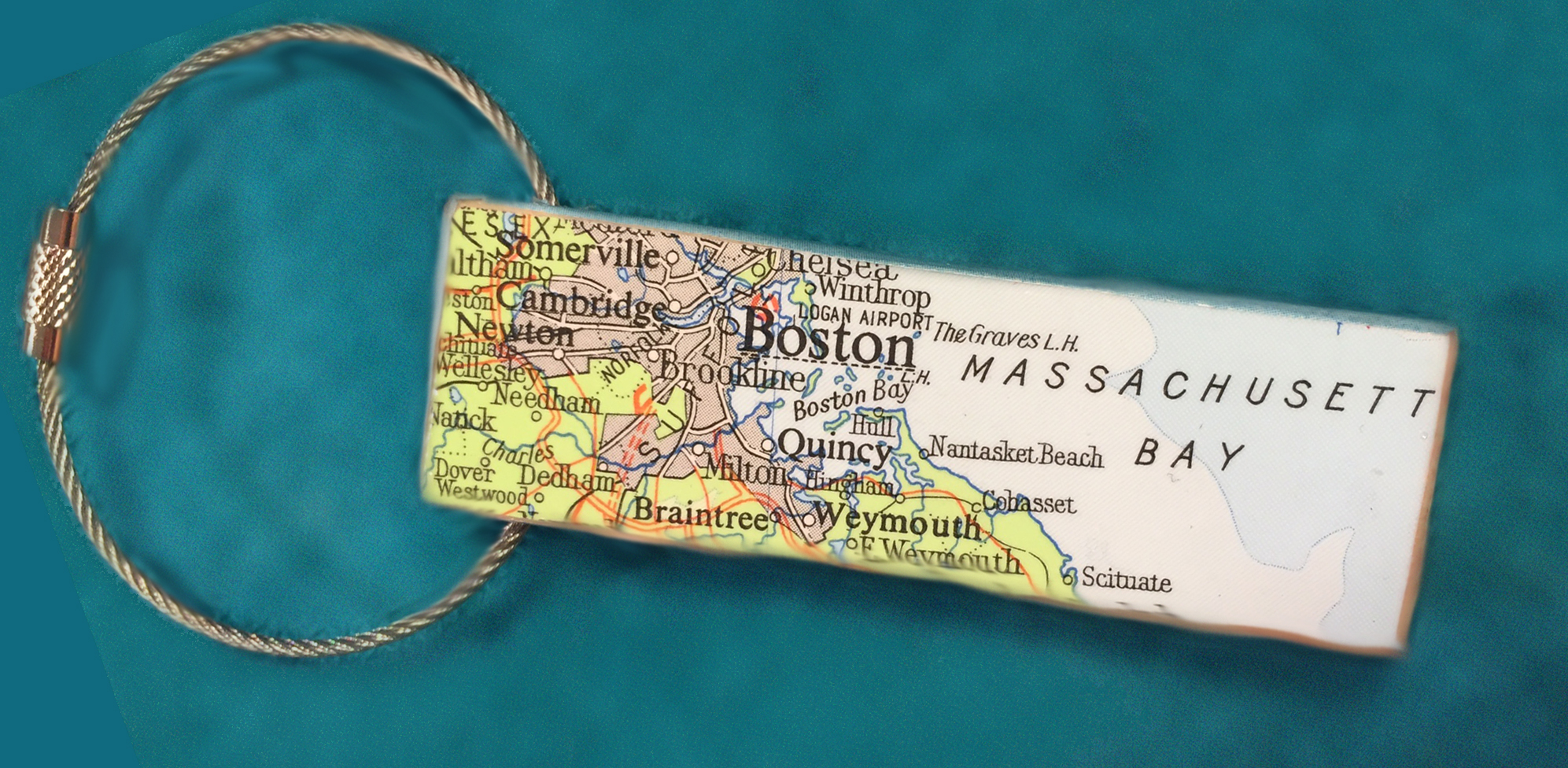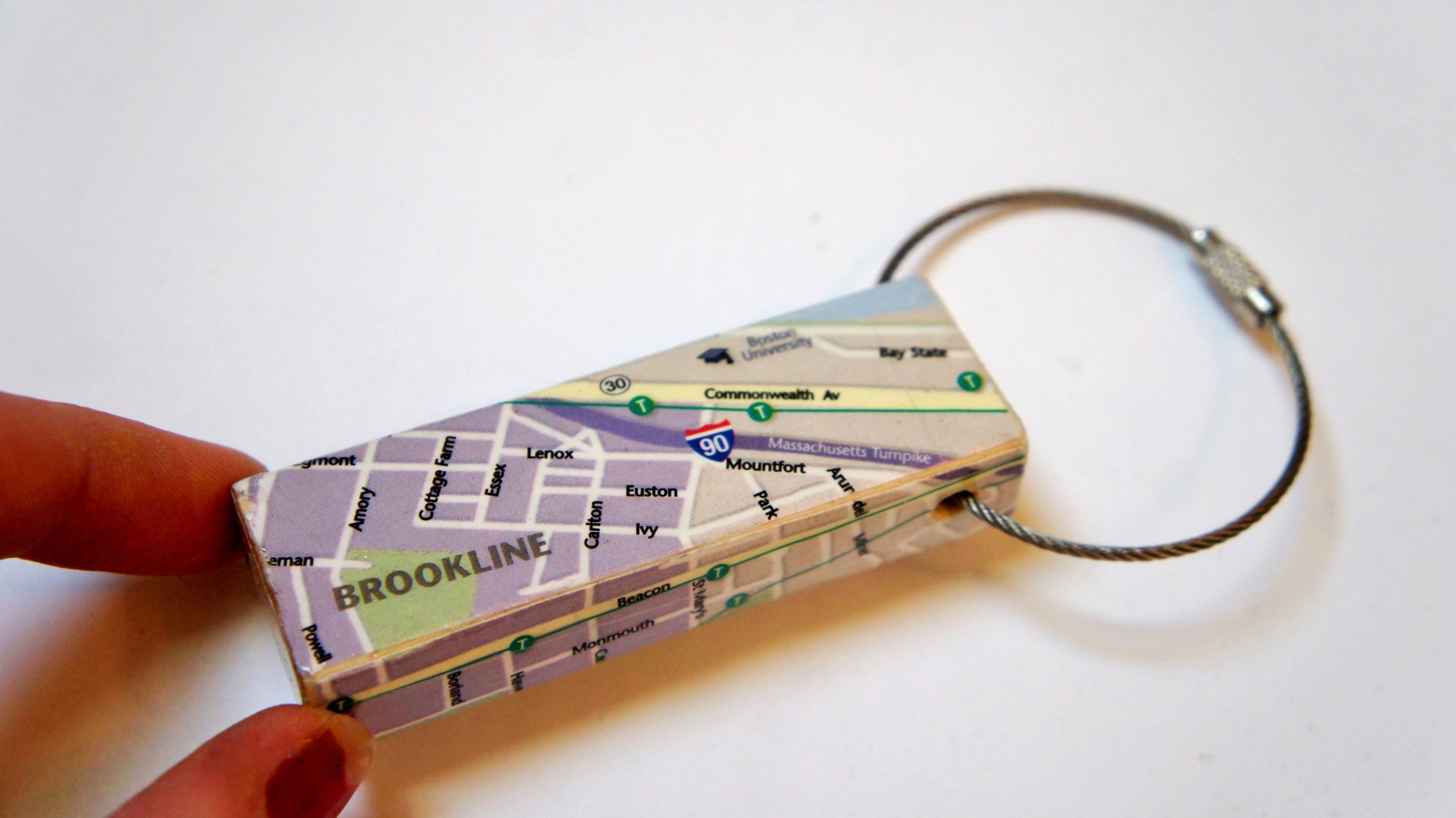 Not included in that list, the most popular keychains ordered by stores across the states are the customized map keychains. Paper maps have proved to be an exciting, descriptive, and meaningful art medium, because of the links to place and environment our personal identities hold. The keychain may say the word “home” on one side, and a map of Brookline or Chicago wraps around the other 5 faces. A map attached to your car keys can certainly prove useful in a pinch, but moreover, the keychain serves as a token of an important place in your life- perhaps where you met your spouse, grew up, went to college, or raised your children.