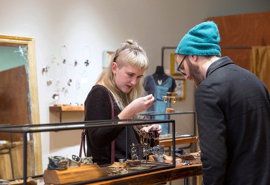 Monique Rancourt Artisan Gallery isn’t your typical gallery space as it is also my Jewelry studio. so 1/4 studio in the back and 3/4 gallery in the front as well as our sister gallery the Lincoln Arts Project. Not only do I make and sell my own jewelry in the gallery I also represent 40+ artists working in all mediums such as Jewelry, ceramics, clothing, wood, paintings, and collage.