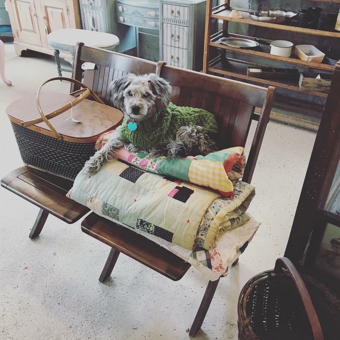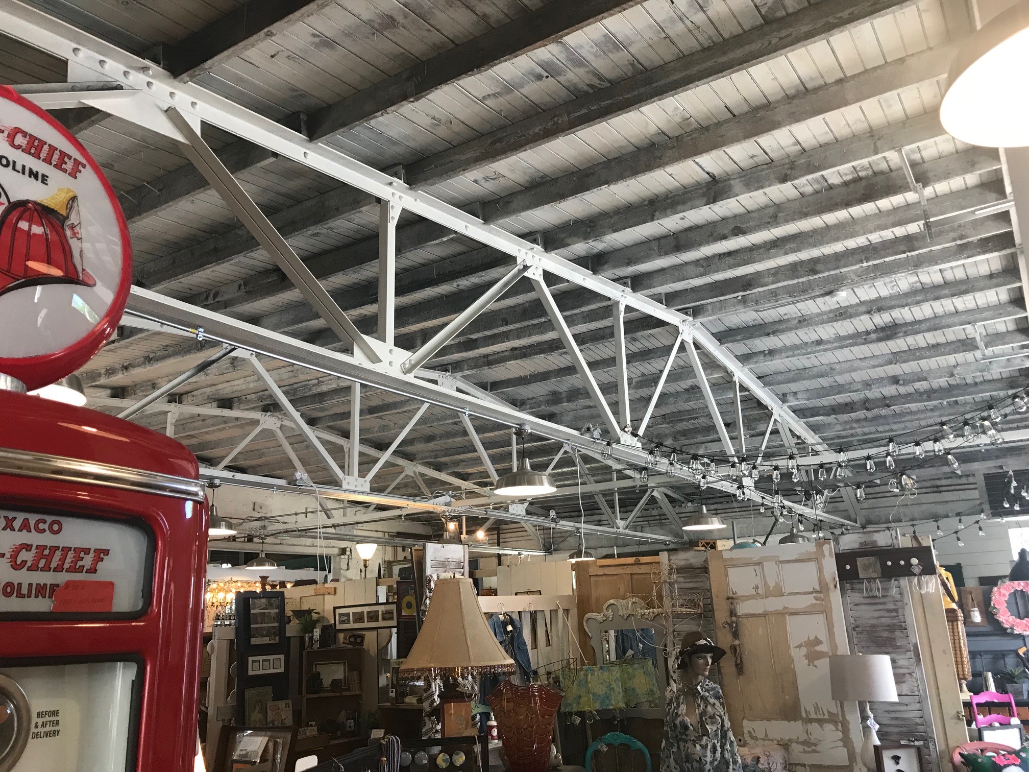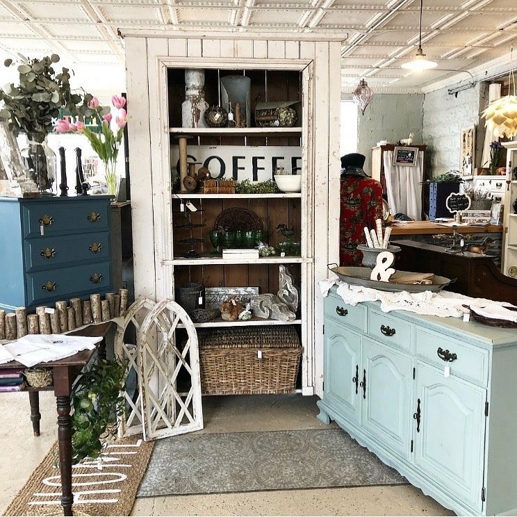Our 4000 square foot antique shop is comprised of vintage, handmade and modern items curated by over 45 artisans. We are located in an old gas station/auto repair shop which was in operation for 112 years. In the 1930’s our shop was a Ford dealership and still has the original tin ceilings and showroom windows. The main shop has beautiful steel beams which my husband white washed giving the atmosphere a farmhouse/industrial feel. The garage door is open in the warmer weather bringing in the sights and sounds of “downtown” Grafton.
