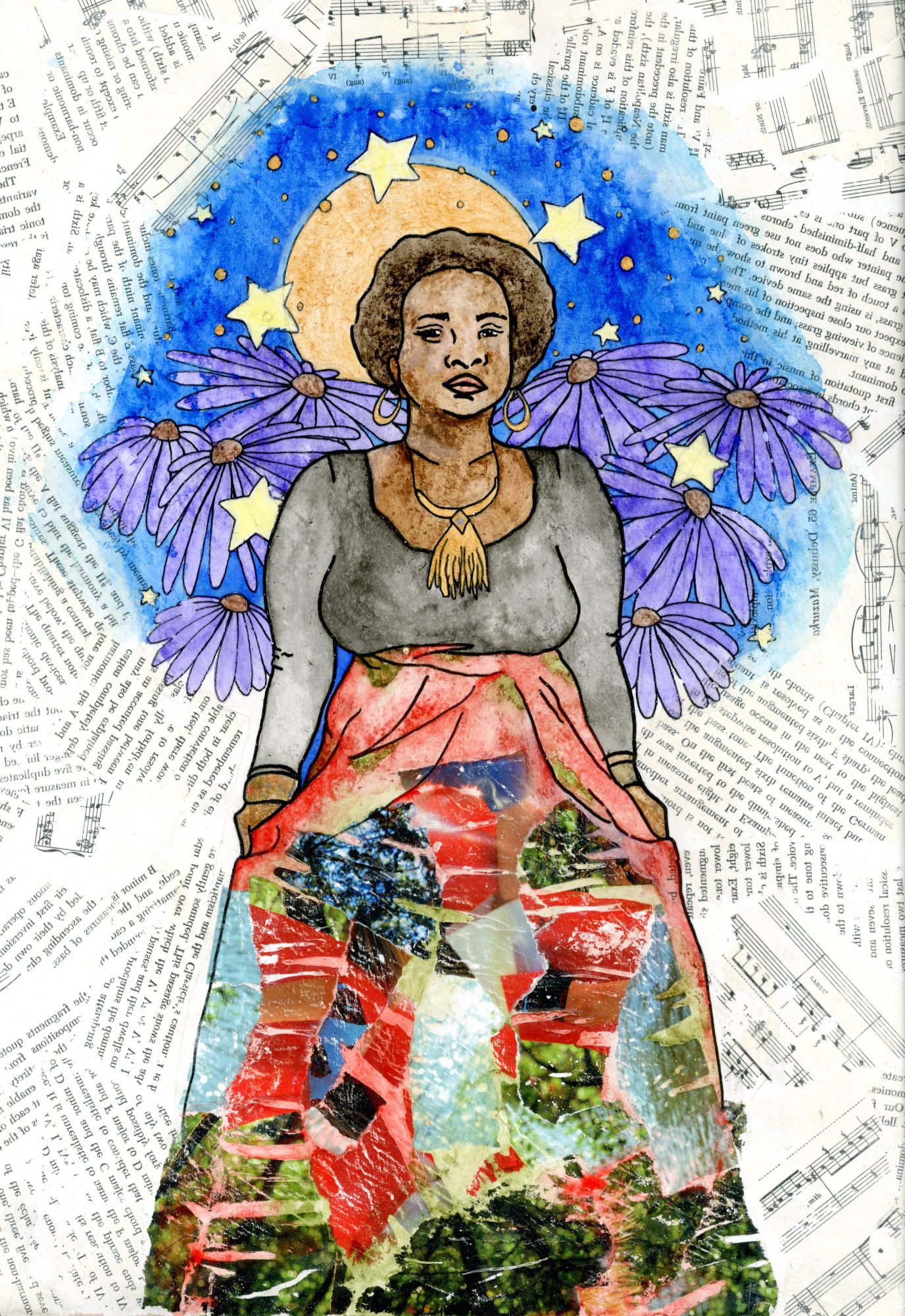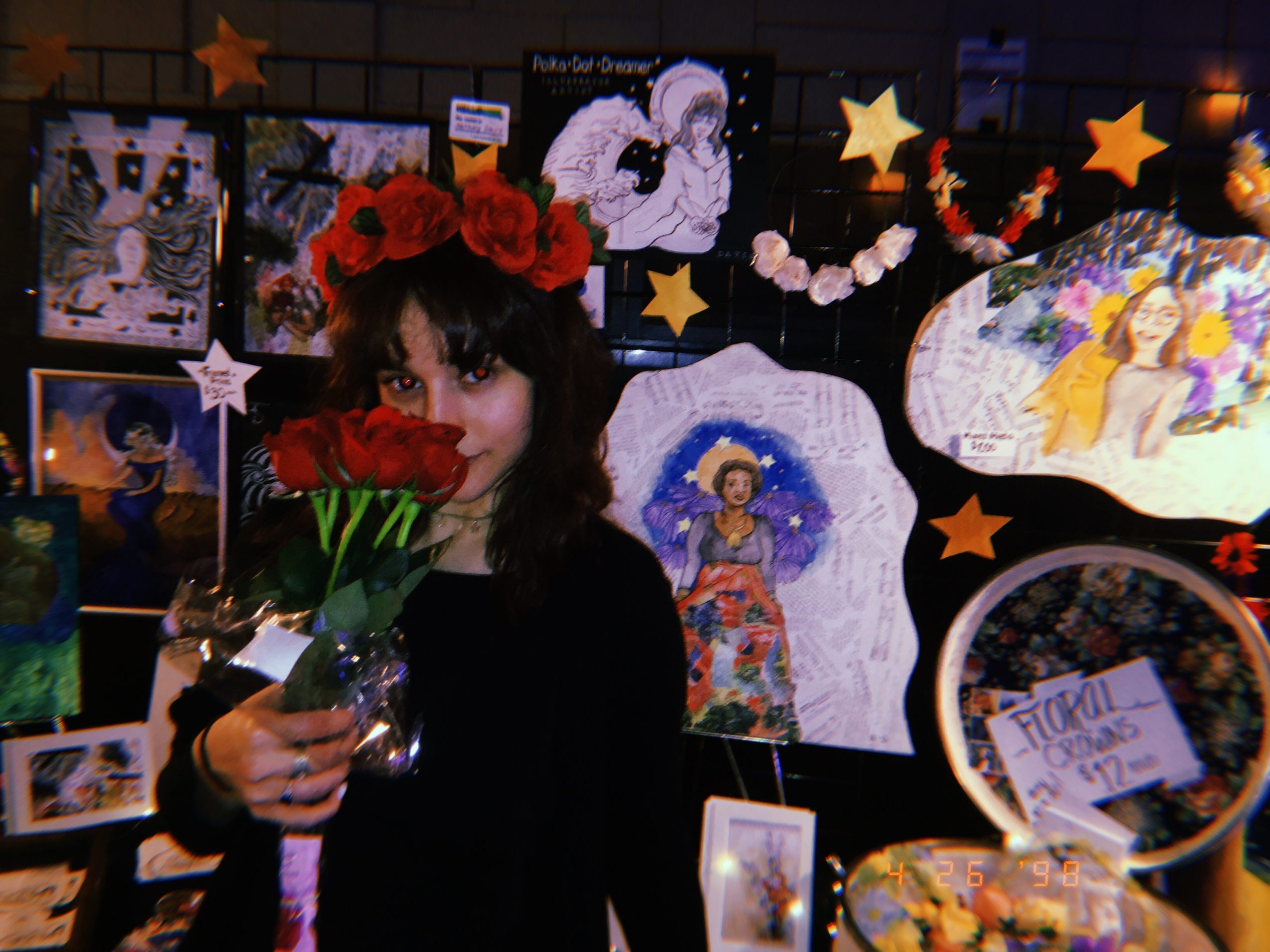 I have a rich contrasting style throughout all of my work, both photo and illustration, that mainly focuses on the soft qualities that capture the best moments and compositions. My floral and retro themes create a unique clash that embody my artwork and everyday fashion. I also use themes of space and astronomy in my work, which together these themes have heavily influenced my style. I pursue versatility in my work, and my personality is distinguished within every stroke of paint or pen mark that I produce. I try to steer away from using traditional surfaces and find recycled and found objects to use and incorporate into my work. Using these pieces is what helps make my work more intimate and personal. As well as my hand woven floral crowns come from my own sense of nature, confidence and beauty, offering a wearable reflection of my creative philosophy. Overall it is my artistic values that I would like people to recognize and take away from my work. Most notably to express yourself through your work, and to never stop creating art.