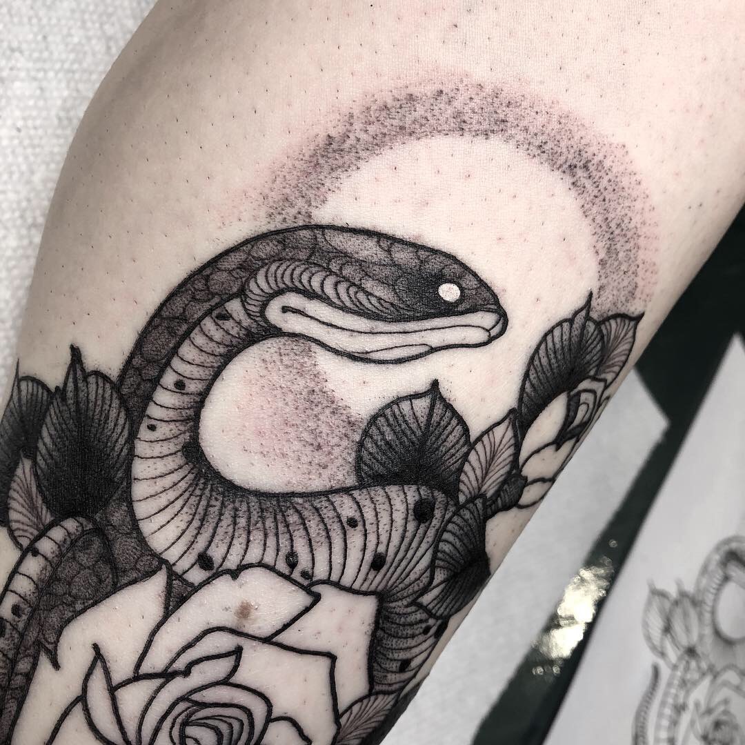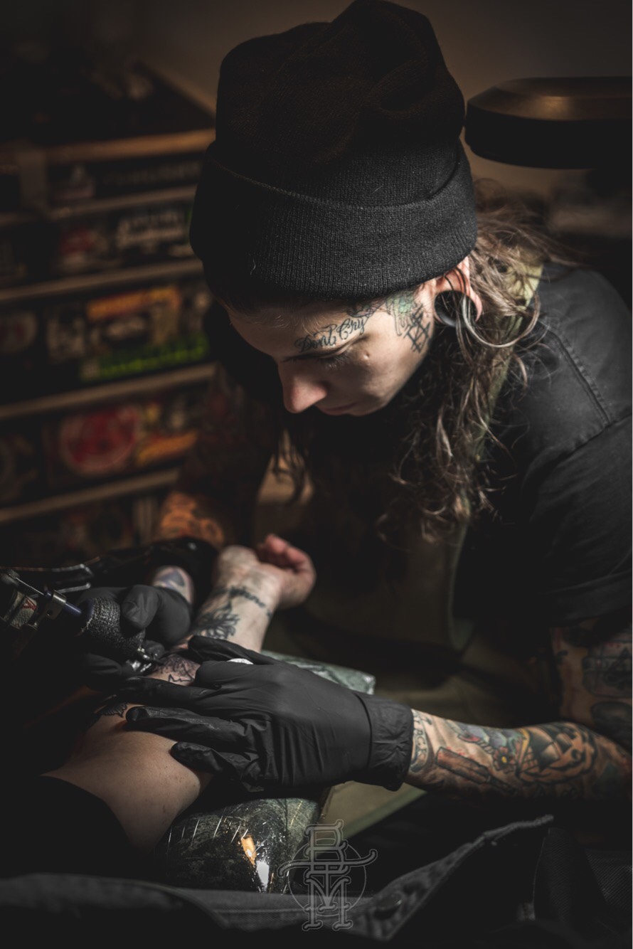 As soon as I was old enough, I just started getting as many as I could. I was working less than pleasant kitchen jobs at the time and every other spare moment I spent hanging out in tattoos shops and just soaking up the environment. After a while of noticing, I was loitering in his shop multiple days a week and taking an interest, one of the tattoo shops I frequented offered to teach me to tattoo, I did a grueling three year apprenticeship where I did everything from coffee runs, floor mopping, tube scrubbing, toilet cleaning, phone answering, appointment booking, and burning my fingertips with soldering irons making needles. All in all, coming up the way I did was a wild ride, lots of highs and lows and lots of learning along the way. I’ve only been in the game for five years, so I still feel very fresh and green, every day is still a new opportunity to improve and get better. It’s taken me all over the place and I’ve made so many friendships and memories, I can’t wait to see where it takes me next.