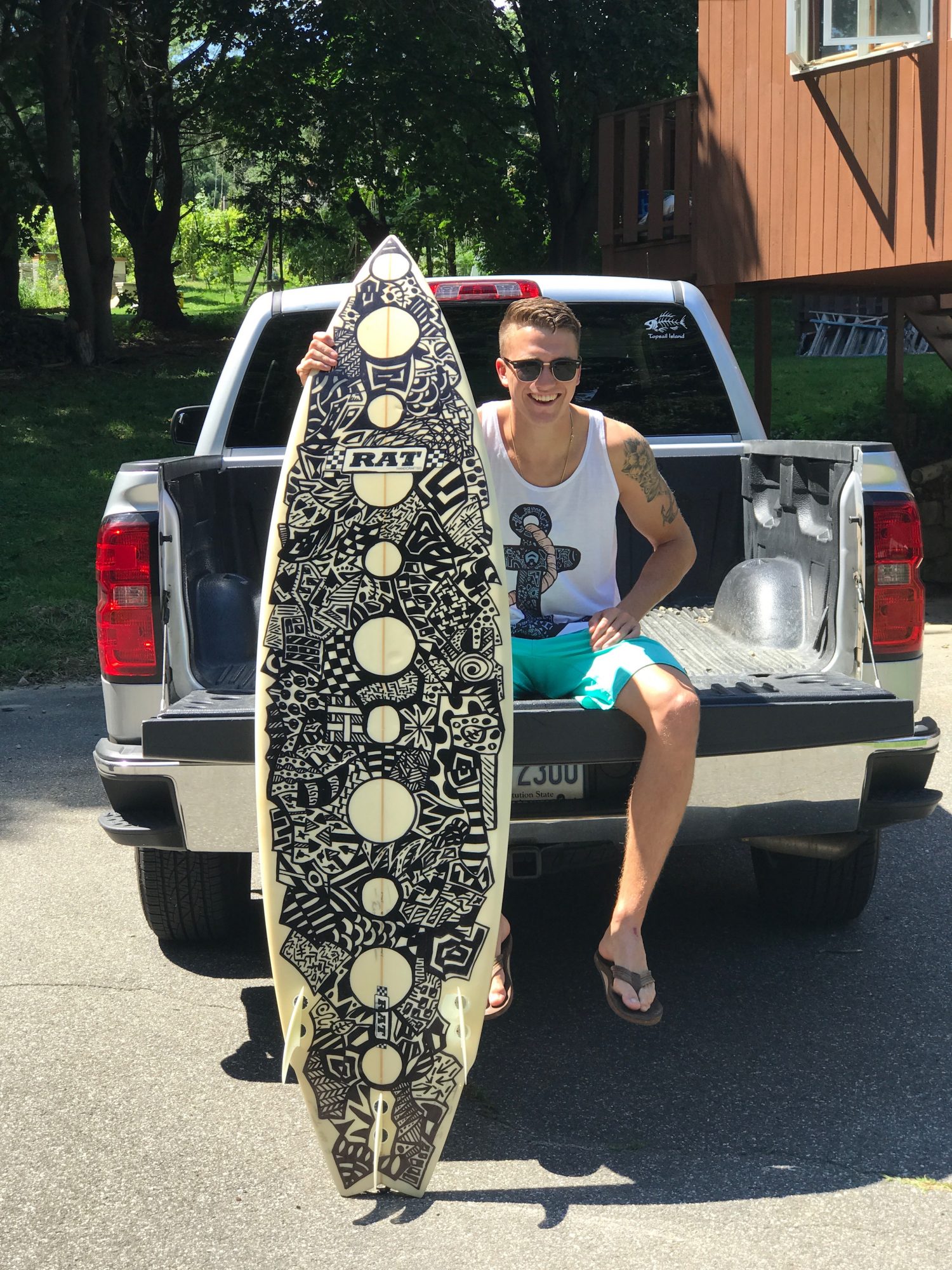 There are four branches off of Adfectu. The first branch, I put my hand drawn designs on shirts, tank tops, long sleeves, baseball tees, sweatshirts, phone cases, pillows, hats, swimwear, leggings and yoga shorts. I am pretty much known for my “doodles” or the random patterns I incorporate onto all of my designs. The second branch is freelance work. I take my doodles to murals, shoes, skateboards, surfboards, corn hole boards, cups, pumpkins and really whatever I can get my hands onto. The third branch is modeling. I have been the main male model for all of my clothes and have been exploring the world of modeling more and more. The last branch is YouTube. If you search “Adfectu Artwork” on YouTube you will see all of my projects from start to finish. These projects include my surfboard, behind the scenes of my photo shoots and how my drawings come to life.