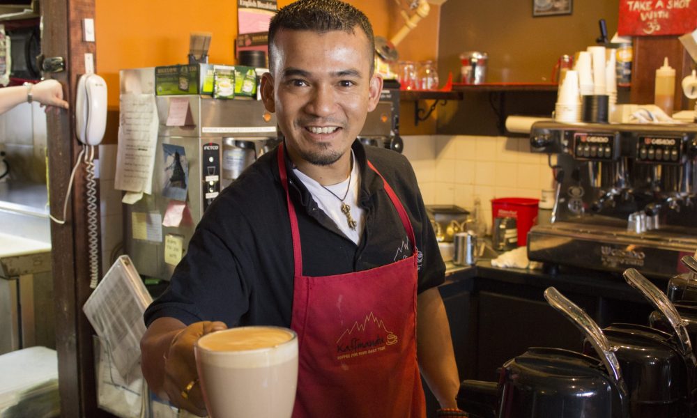 Three months after I’d assumed ownership of my new shop and my wonderful patrons had become more familiar with me and the coffees I was offering, in February of 2014, I took the final step of renaming and rebranding the business with the name KAFFMANDU, an homage that reflects both what we do and a bit of my heritage.