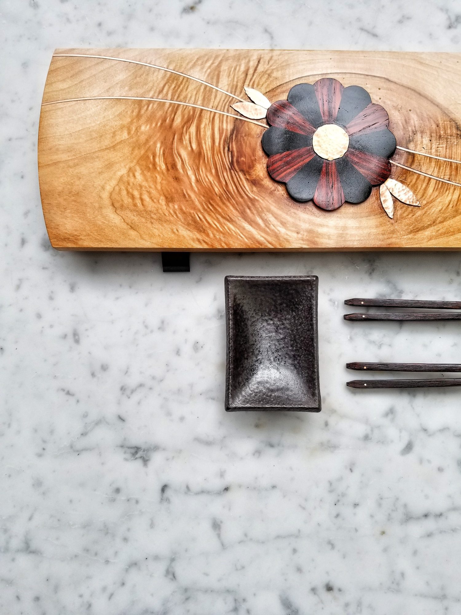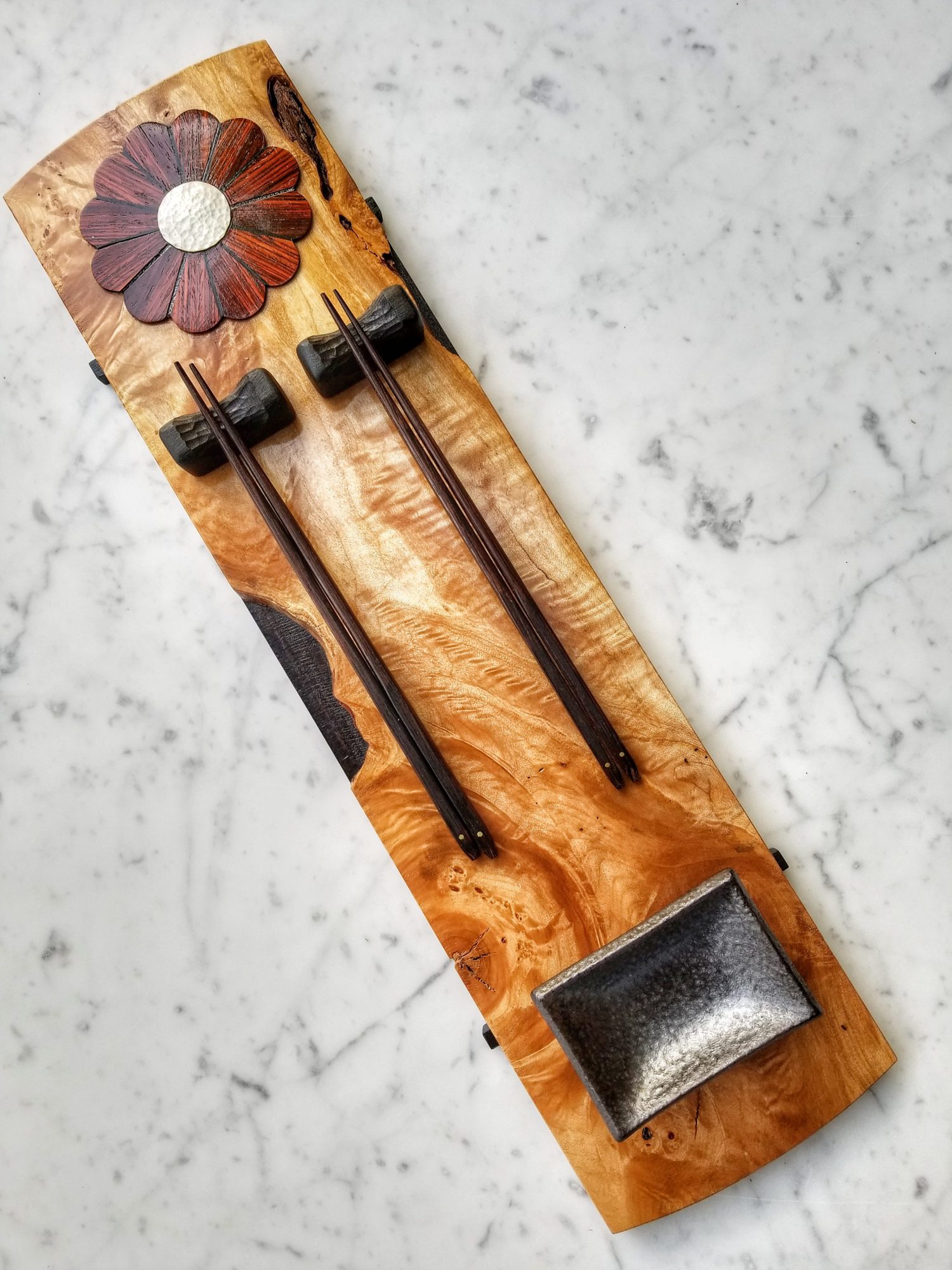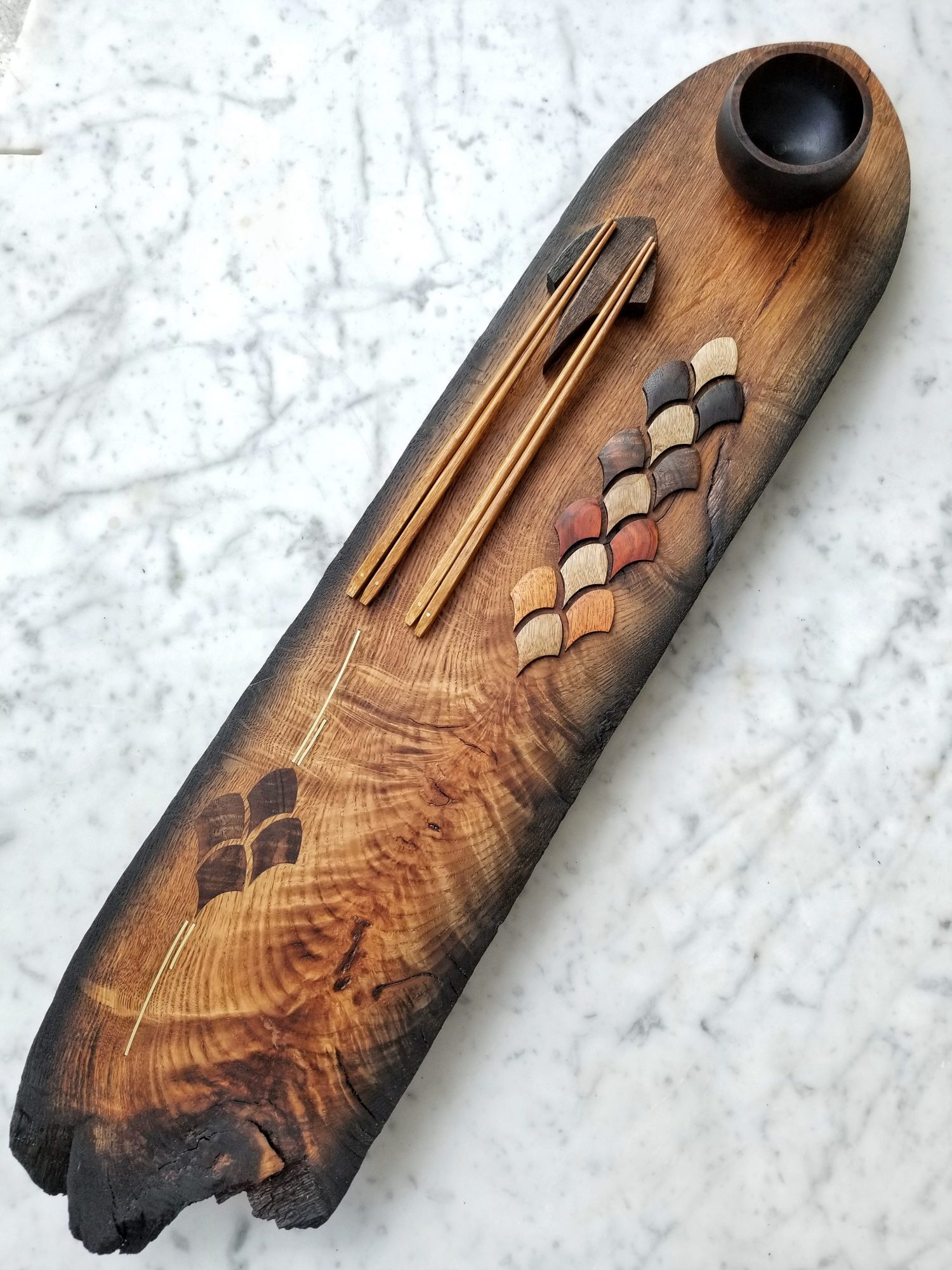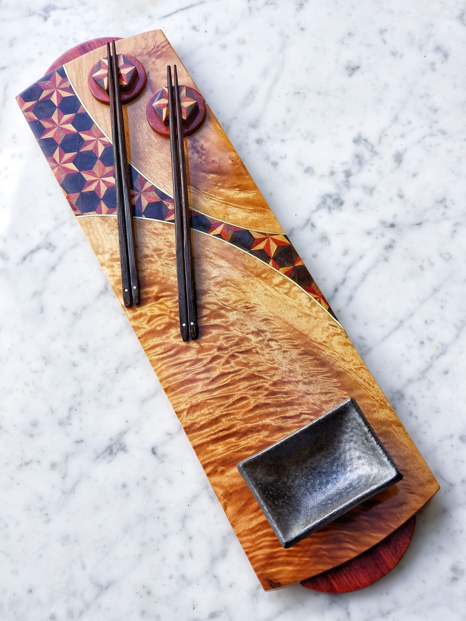 This artistic exploration has largely manifested in the form of decorative sushi boards and charcuterie serving boards, which I collectively refer to as “functional art”. It brings me deep personal satisfaction to know the pieces I make are regularly used and bring even small moments of happiness to those who use and cherish them.