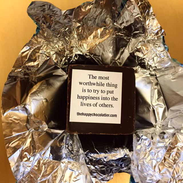 All of our truffle Cubze are hand foiled and contain an inspirational quote about happiness as an added treat! People often tell us the little cards with the happy wisdom are something they keep — taping on a phone or laptop, putting in a milk bottle in the kitchen window, taping the refrigerator and evening pinning to the wall in their workplace.