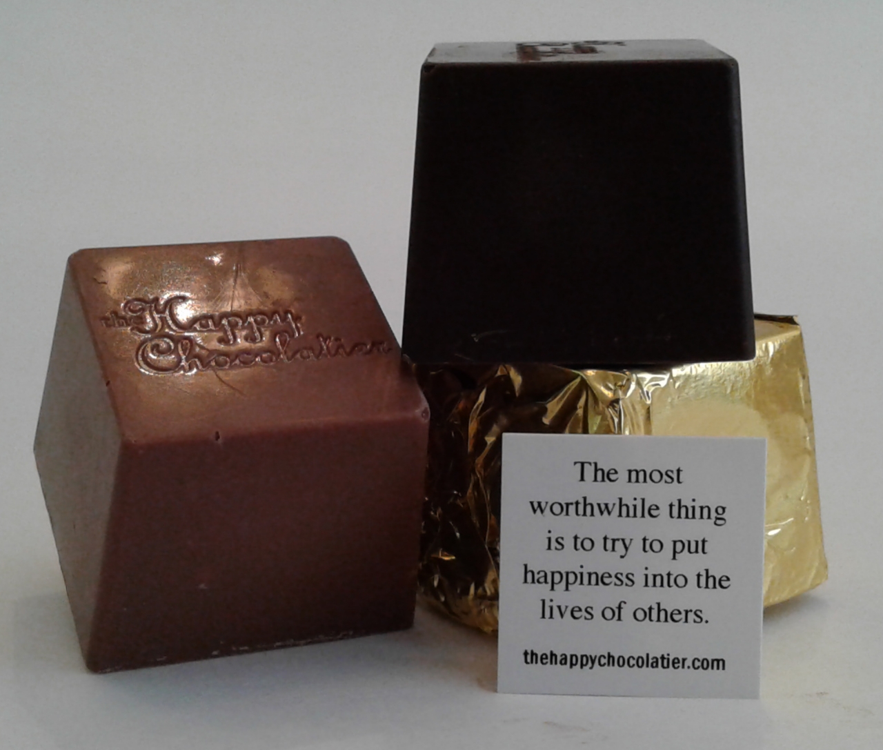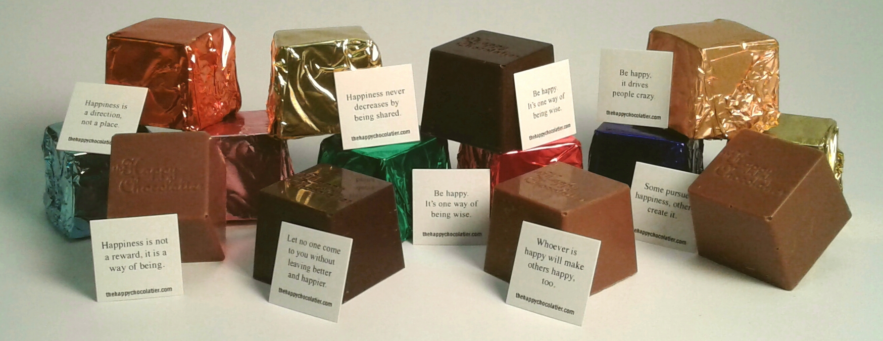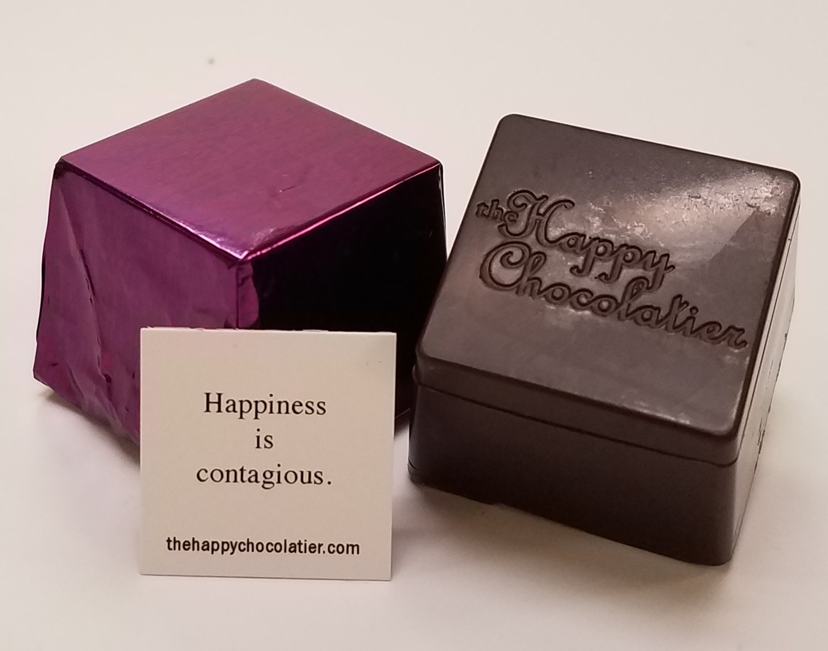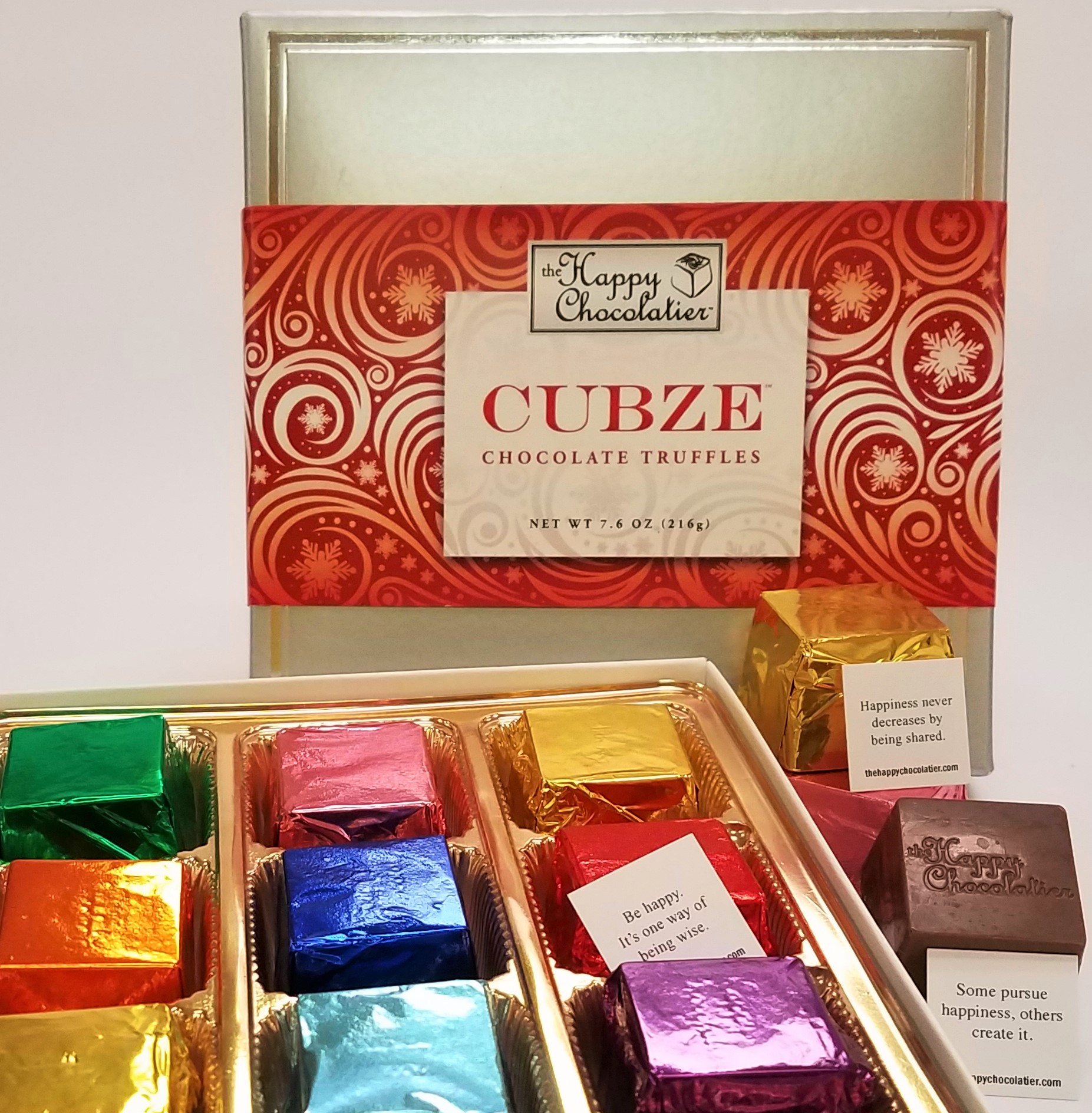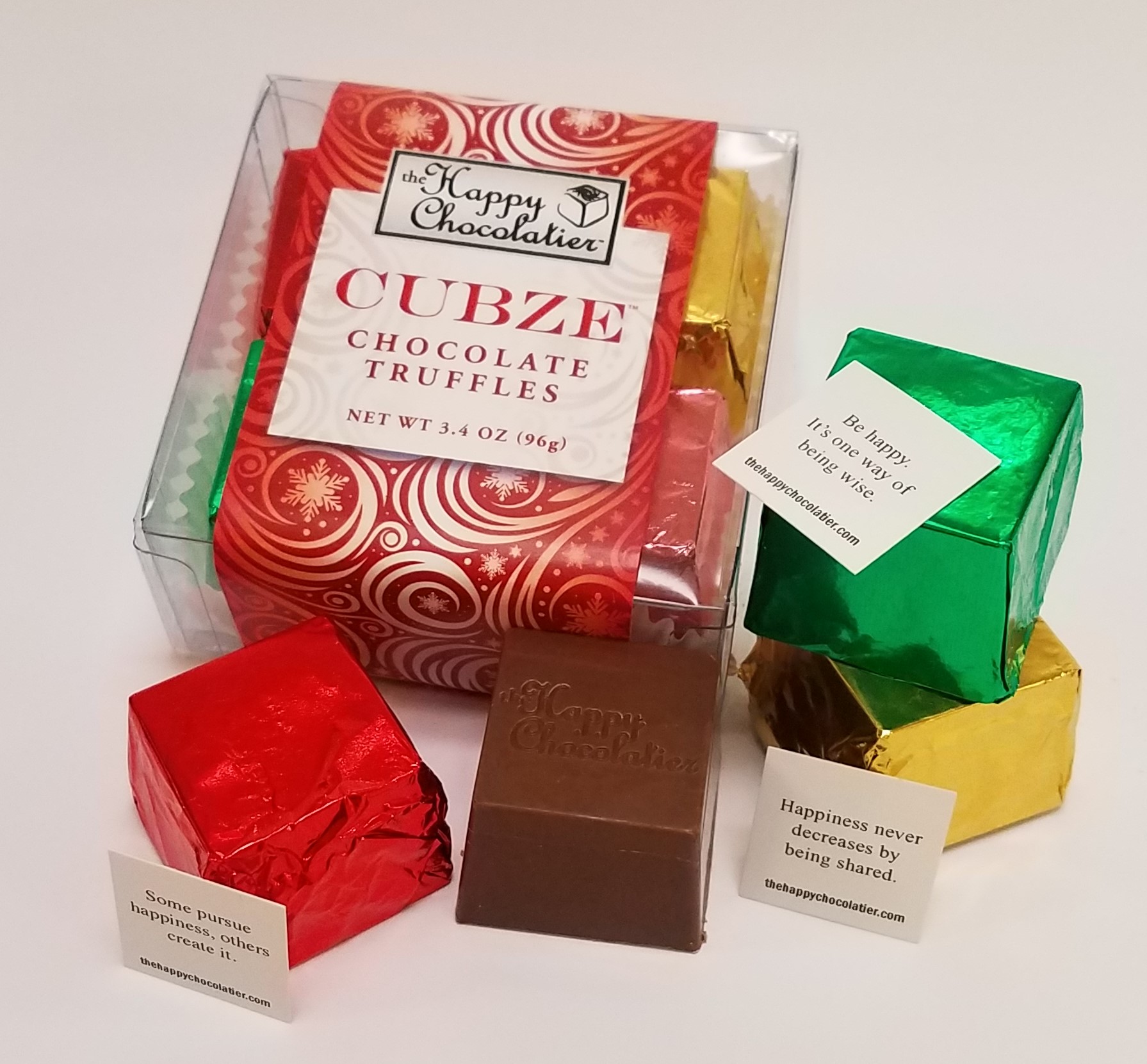 The Happy Chocolatier™, founded in June 2011, spreads happiness with high-quality, all natural truffle Cubze™ and other chocolate confections, as well as an exceptional customer experience. Our signature chocolates, Cubze, are unique truffles in a cube shape. Each Cubze piece is coated in chocolate and hand foiled along with an inspirational message about happiness. They provide a delicious and memorable experience for the consumer.
