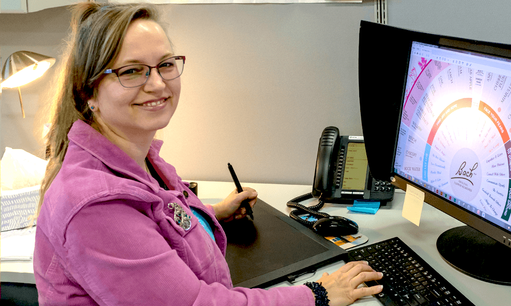 On a day-to-day basis I do a lot of the design. You can find me designing packaging, presentations, digital and online content, information graphics, you name it. There is always something different. Although I’m the only “me” here, I do not work alone. I work with a group of smart people—from Marketing and Branding to Regulatory, Sales, Finance, and Customer Service—who inform every project. One of the bigger projects last year was redesigning Bach’s U.S. line of 38 remedies, and again for Canada recently. The U.S. bottles are appearing on store shelves now. I worked in digital for years but there’s something magical about holding the actual final result in your hand.