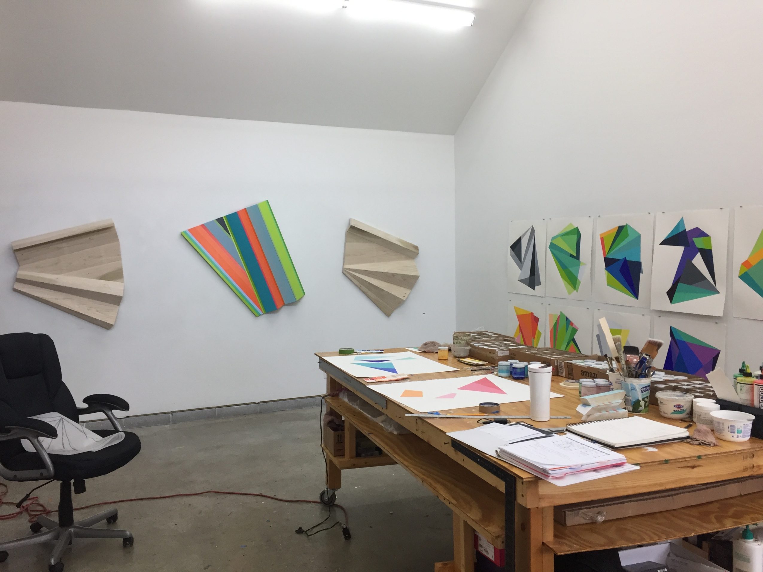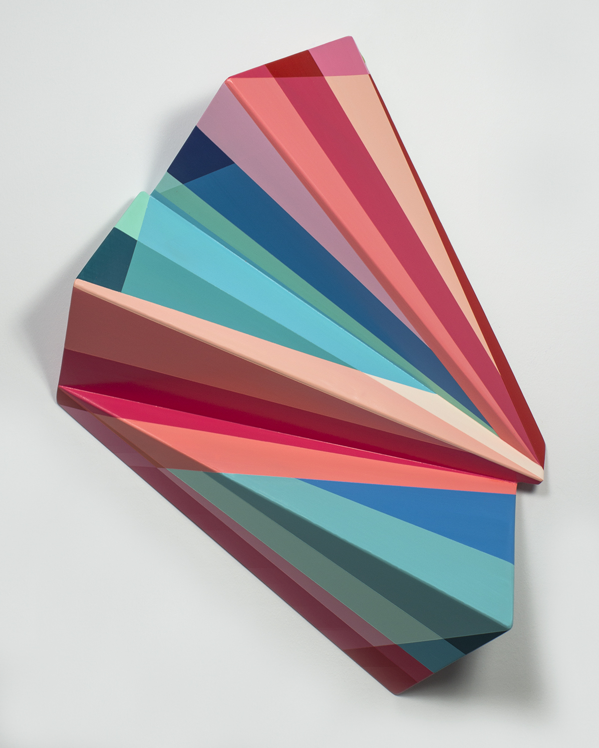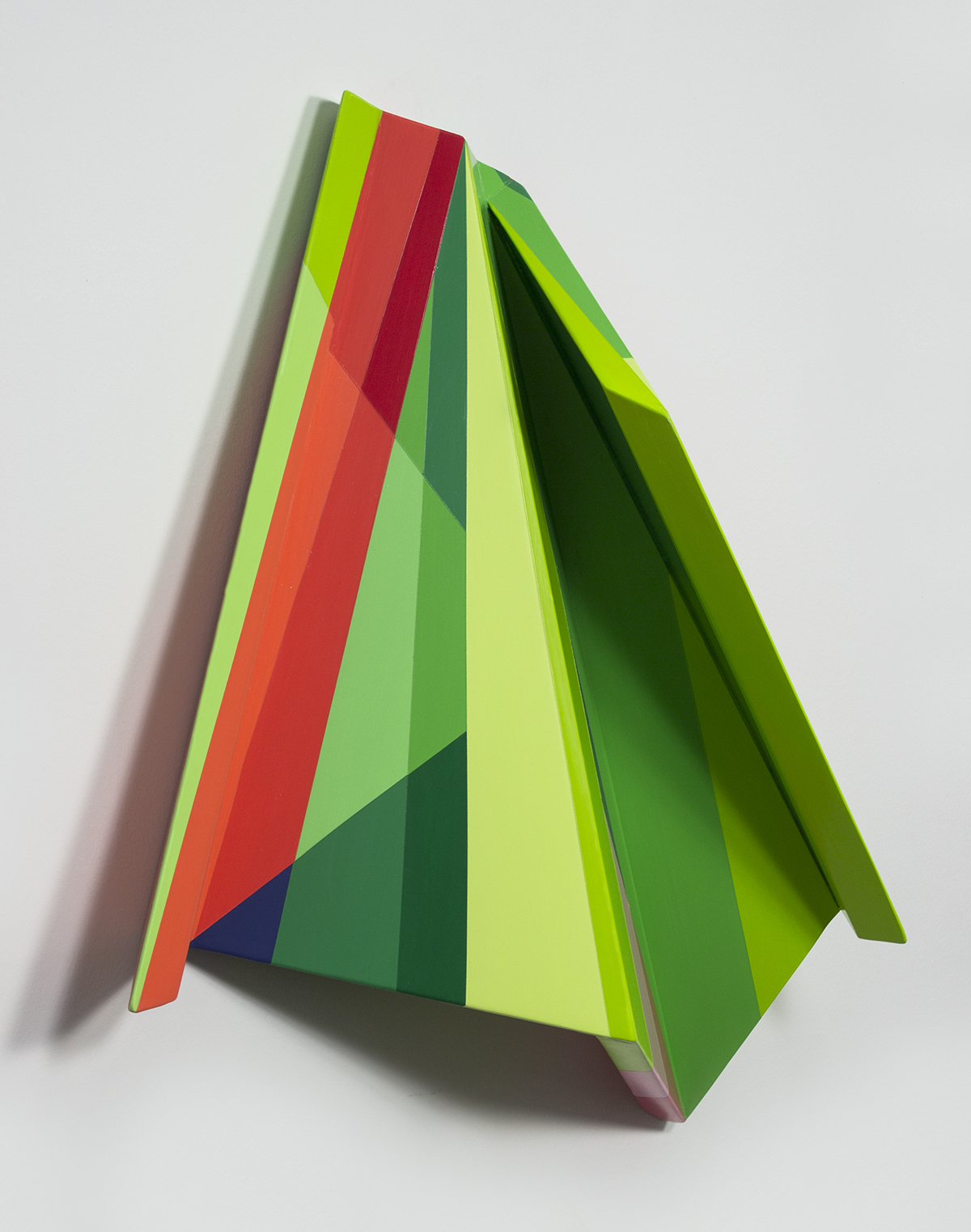My process for the sculptural pieces is similar to that of fitting together a puzzle. I cut and fold shapes with cardboard and paper to test their different configurations and then recreate these forms with poplar wood. The wood pieces are cut, sanded and joined together with dowels, screws, and adhesives. After final sanding and priming, I paint bright, geometric fields of color on all sides, both adjacent and intersecting with the lines and shadows formed by the irregular surface. The combination of the built form and the painted surface creates a conversation between the actual dimensionality of the piece and the perceived dimensionality.