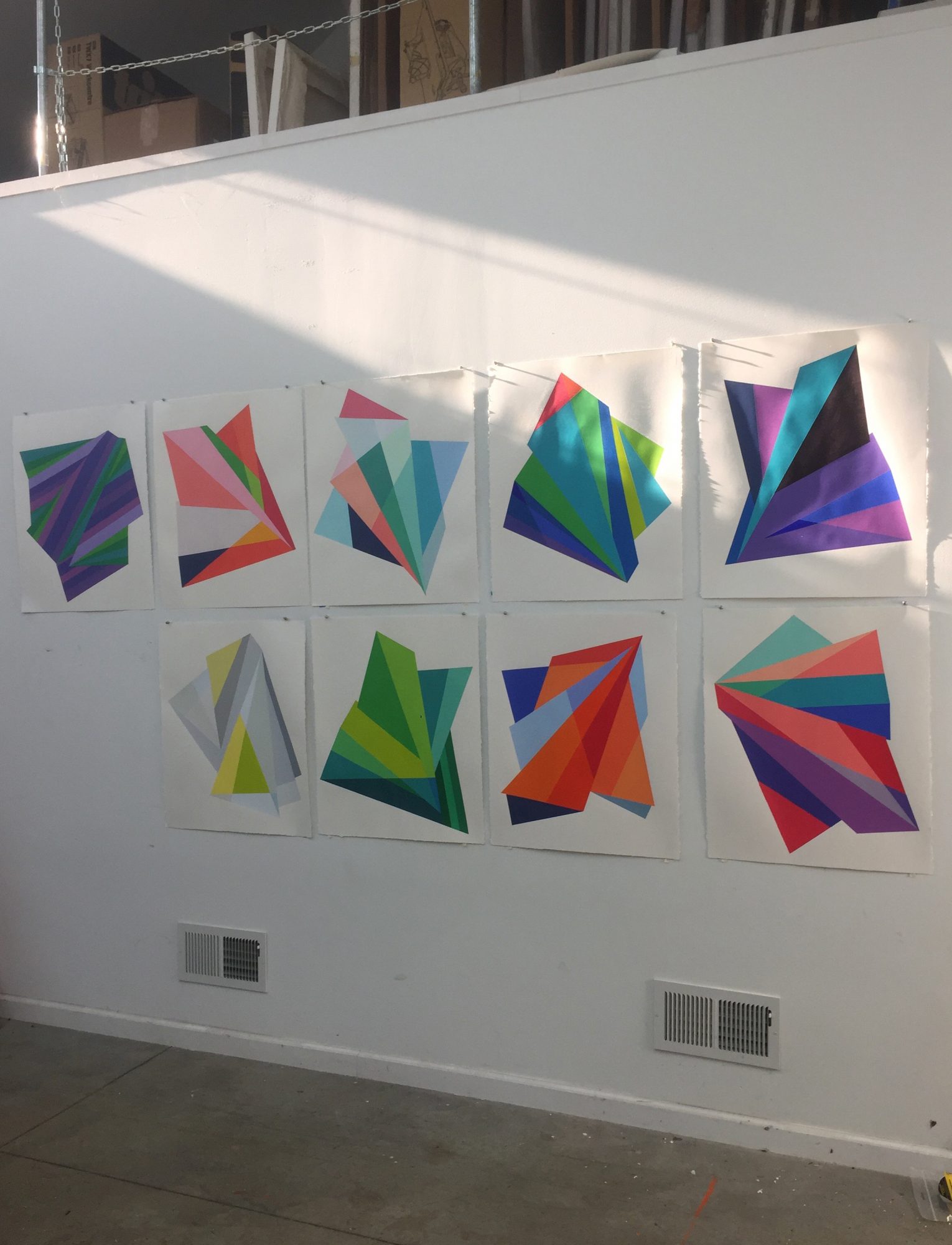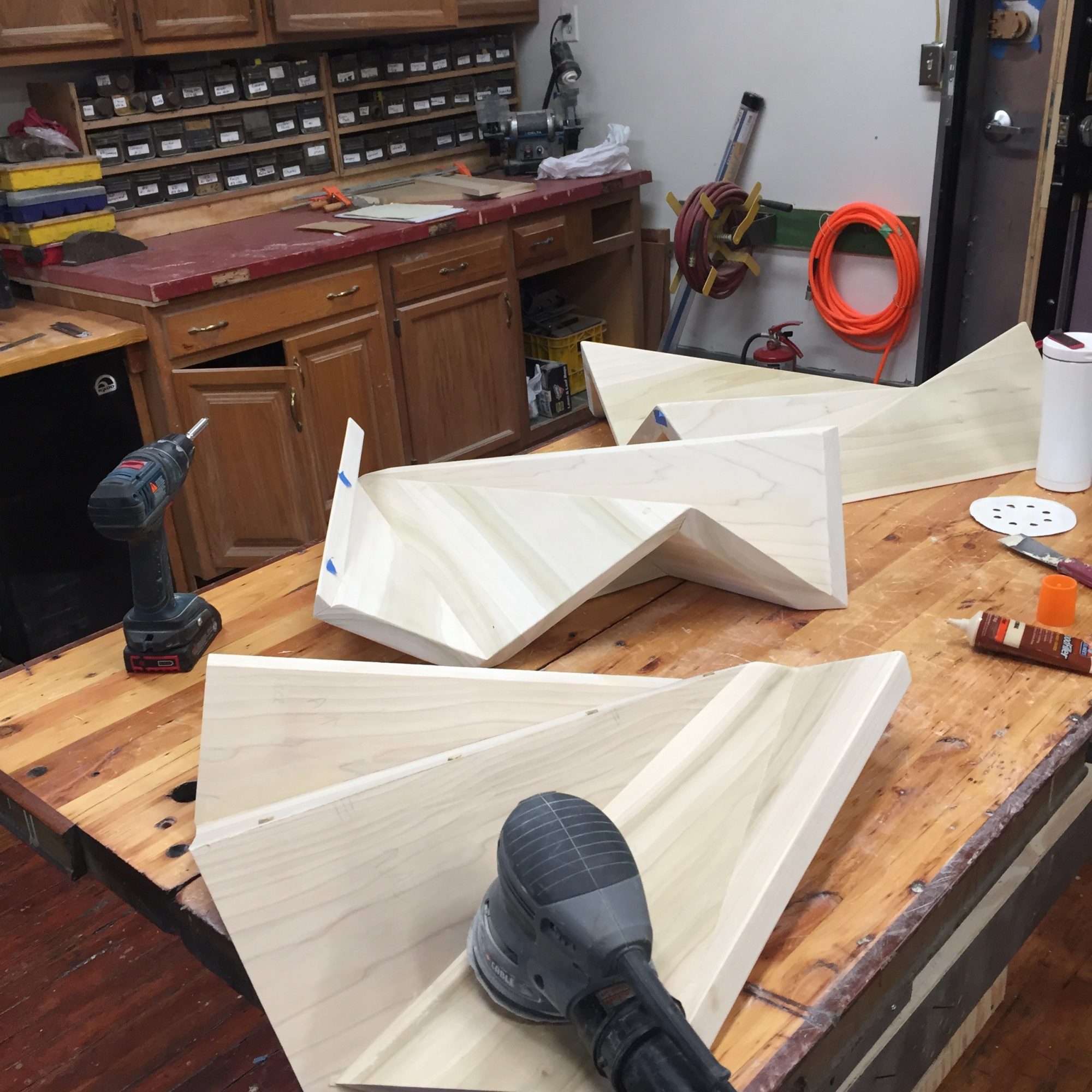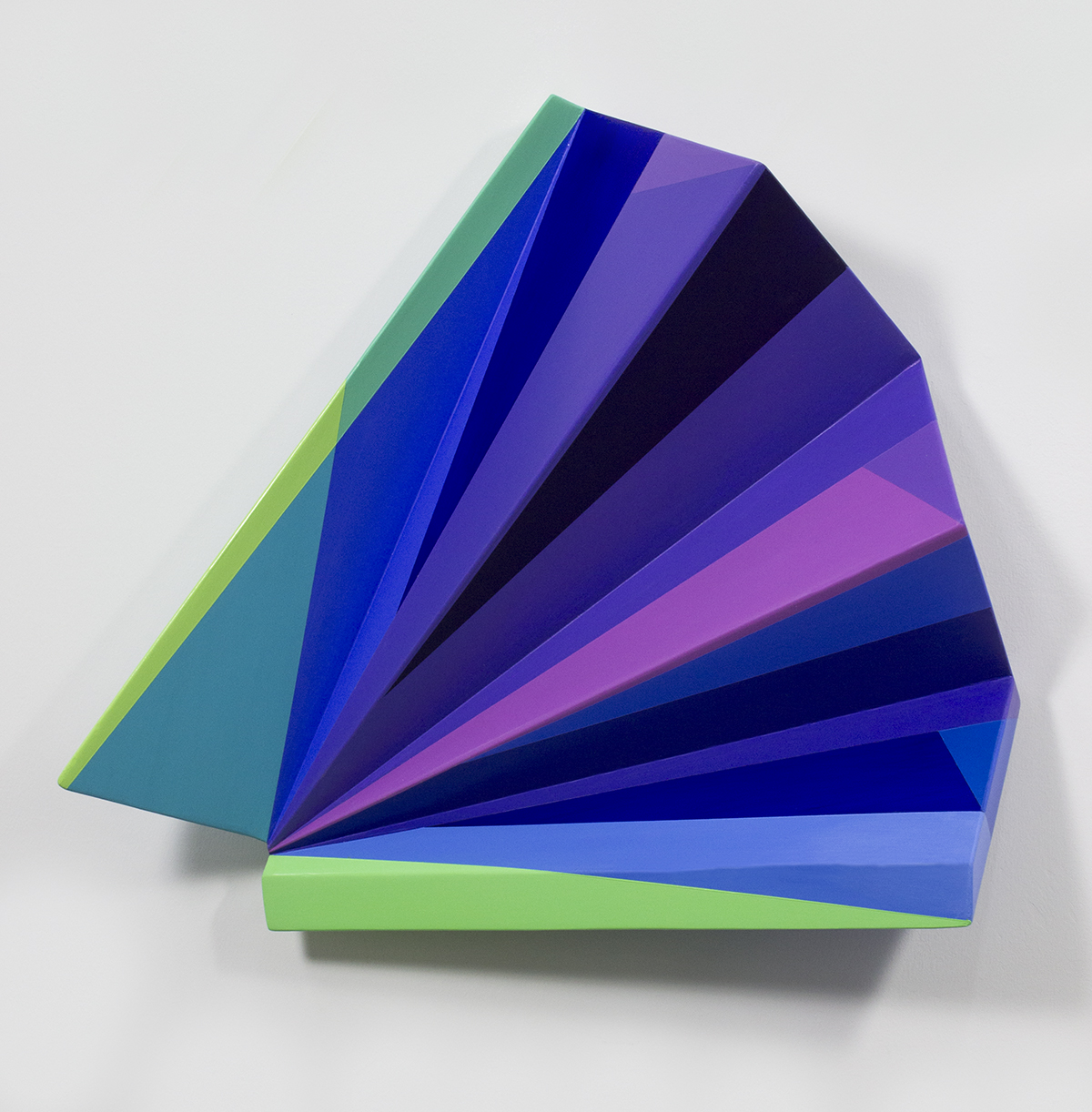 My process for the sculptural pieces is similar to that of fitting together a puzzle. I cut and fold shapes with cardboard and paper to test their different configurations and then recreate these forms with poplar wood. The wood pieces are cut, sanded and joined together with dowels, screws, and adhesives. After final sanding and priming, I paint bright, geometric fields of color on all sides, both adjacent and intersecting with the lines and shadows formed by the irregular surface. The combination of the built form and the painted surface creates a conversation between the actual dimensionality of the piece and the perceived dimensionality.
