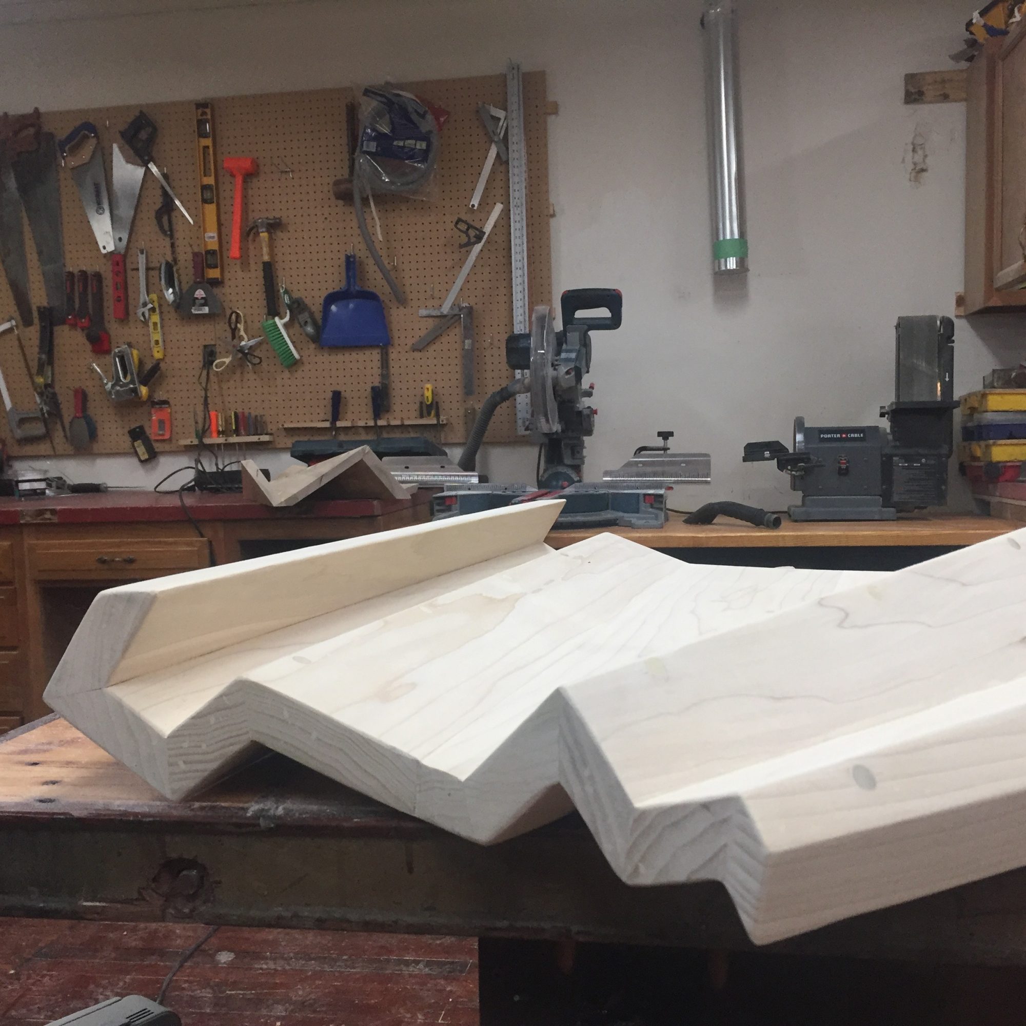 About five years ago, I moved away from Boston and returned to my childhood town in Indiana to work full-time in the studio. Because of this move, options and resources began to fall into place to push my work to the sculptural place that I had been leaning. I began working with my father who taught me how to translate my foam core models into sculpted wooden forms. I also gained access to a full wood shop – the same wood shop that my grandfather worked in as a furniture maker fifty years ago. Moving back to Indiana, allowed me to come full circle – connecting my artistic vision with that of a family history laced with carpentry and craft. I now complete the majority of the woodworking on my own, however, my father continues to work with me every now and then on the larger, more complicated pieces.