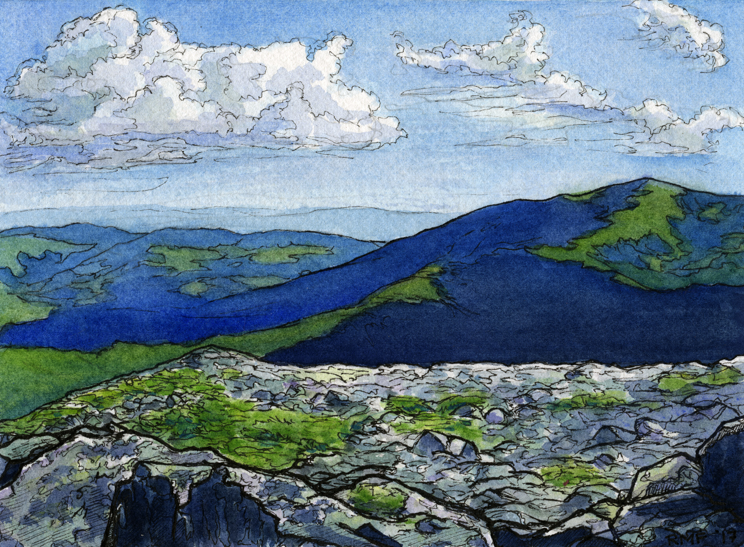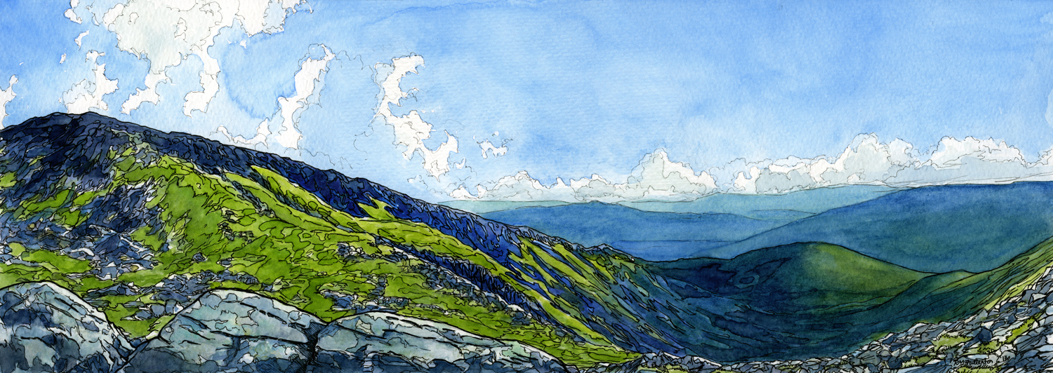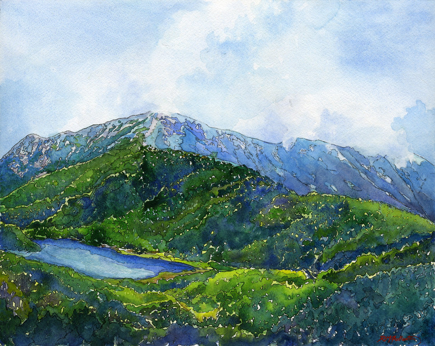 I work almost exclusively in watercolors and oil paints, both on very small scale paper pieces and on canvases up to four feet wide. The subject is usually New England mountain landscapes. A painting starts with a sketch or photo from the field. I hike into the woods, or up above mountain treeline. There I settle down on a rock or log with my sketchbook and a lightweight paint kit I can stuff in my backpack.