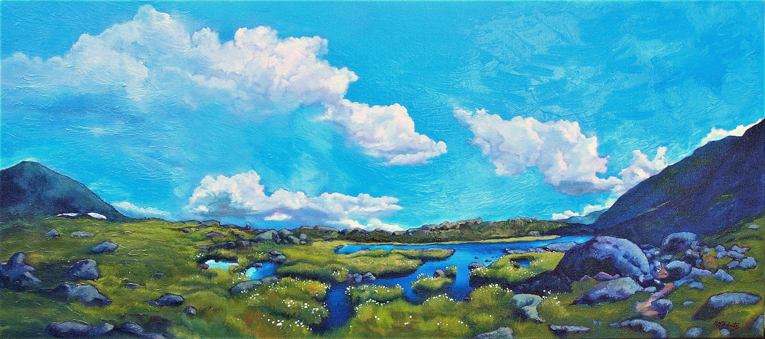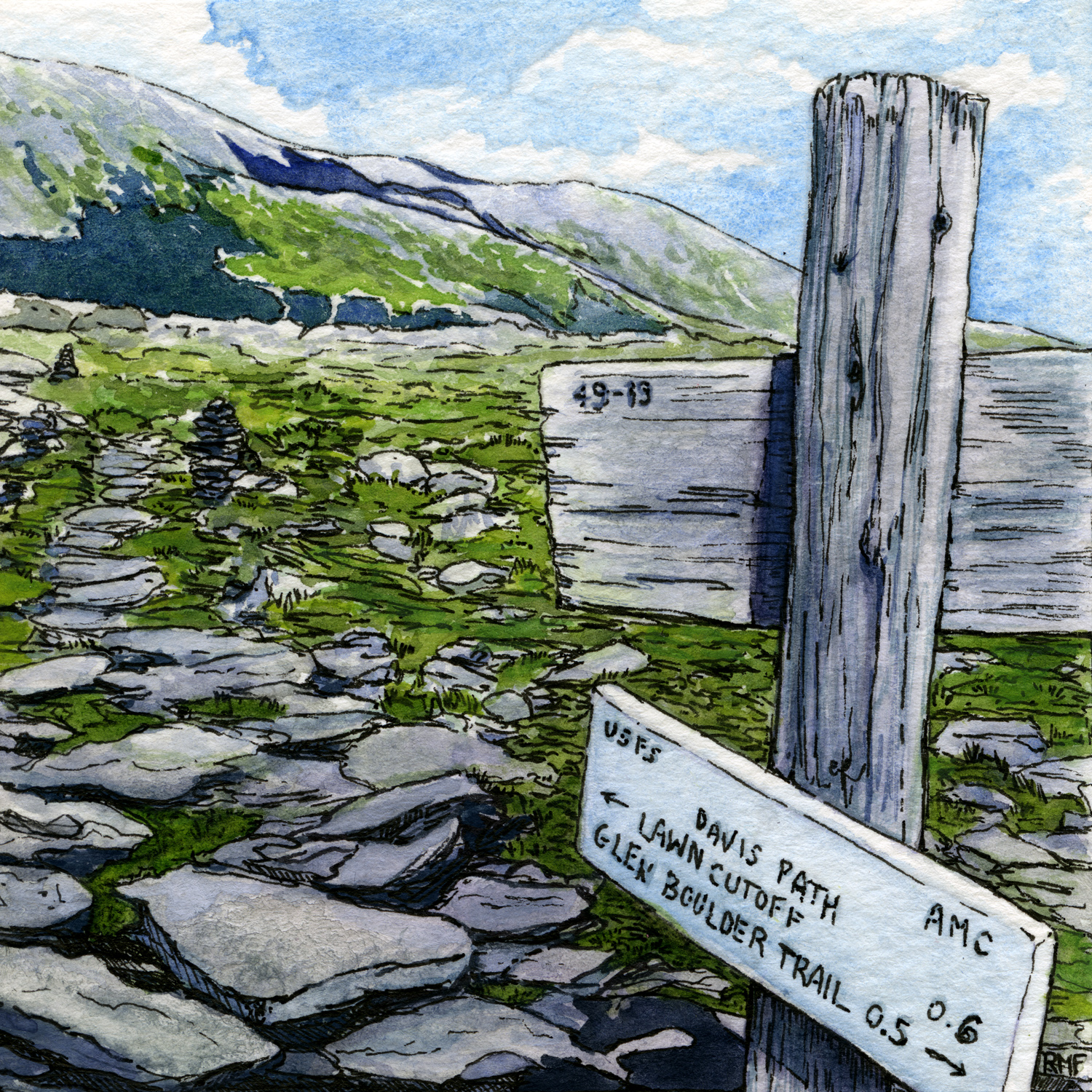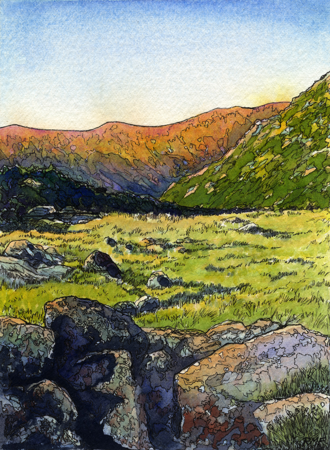 I work almost exclusively in watercolors and oil paints, both on very small scale paper pieces and on canvases up to four feet wide. The subject is usually New England mountain landscapes. A painting starts with a sketch or photo from the field. I hike into the woods, or up above mountain treeline. There I settle down on a rock or log with my sketchbook and a lightweight paint kit I can stuff in my backpack.