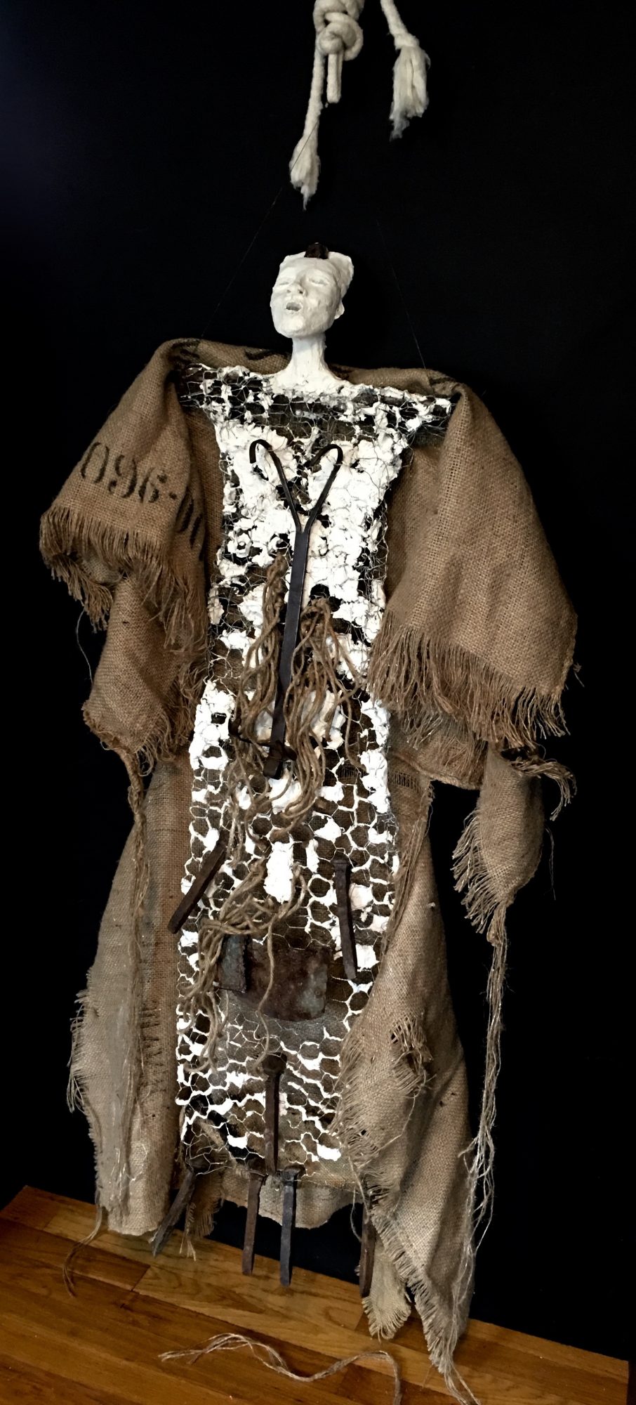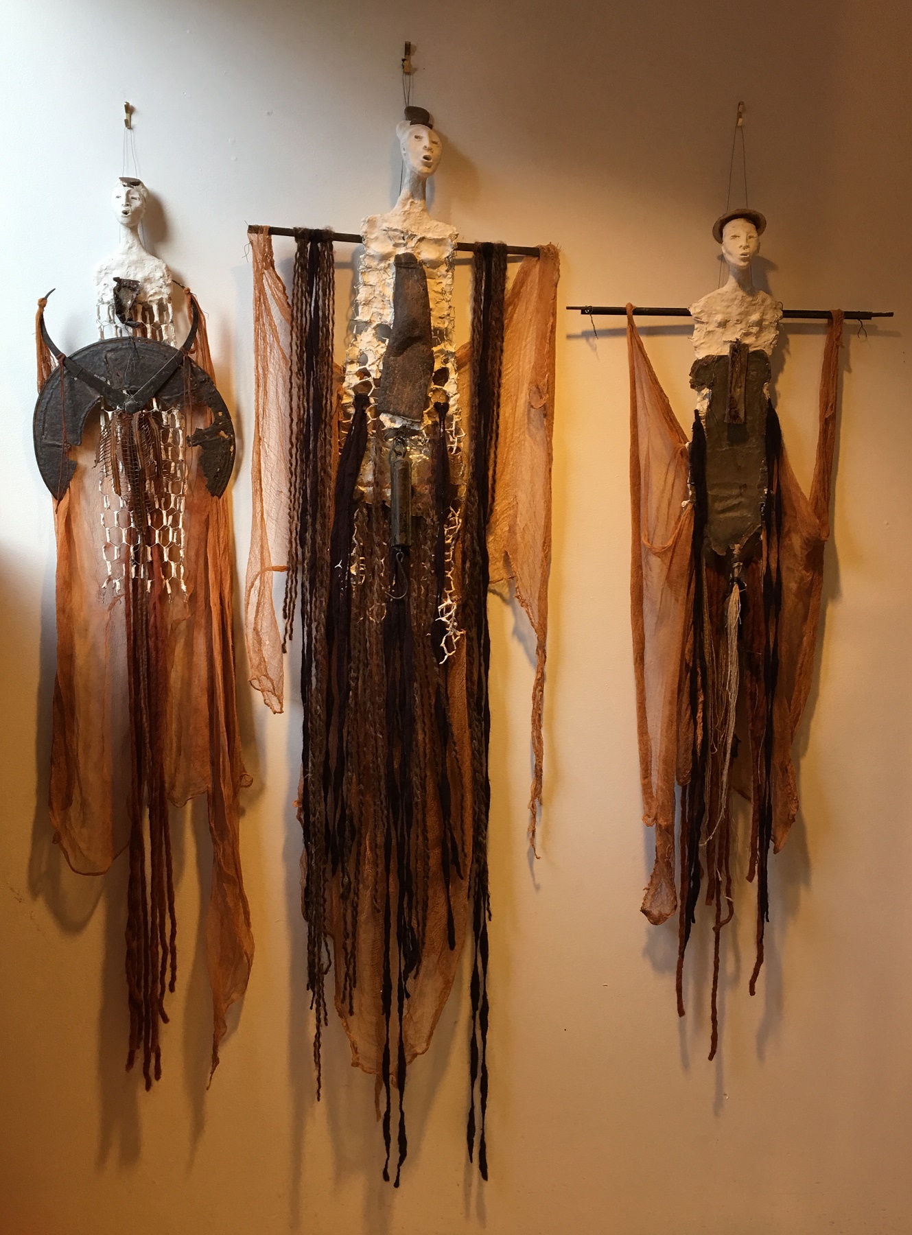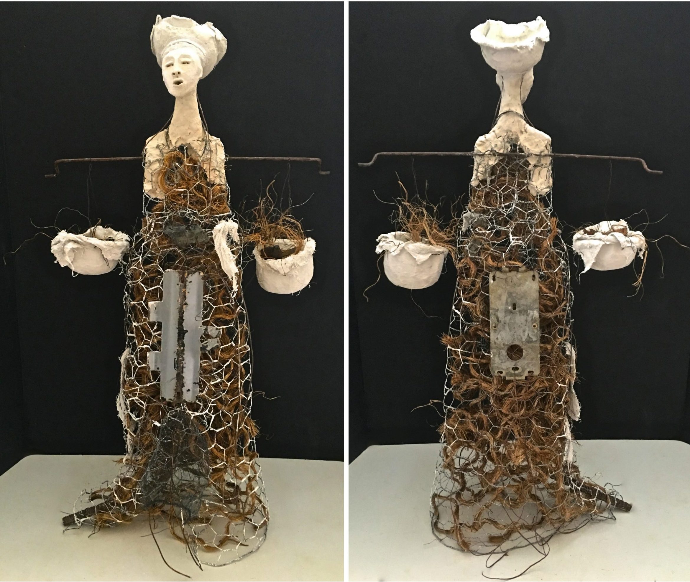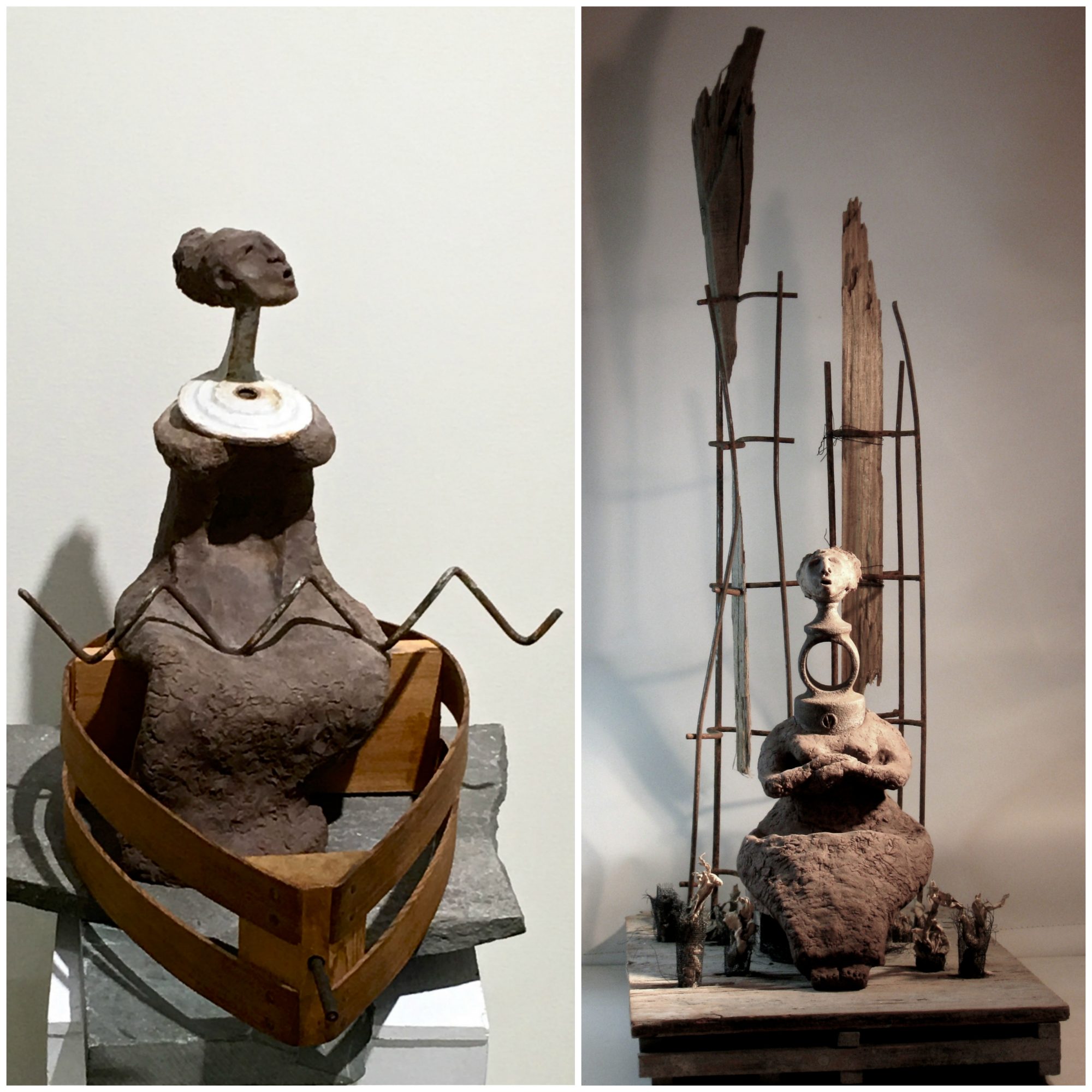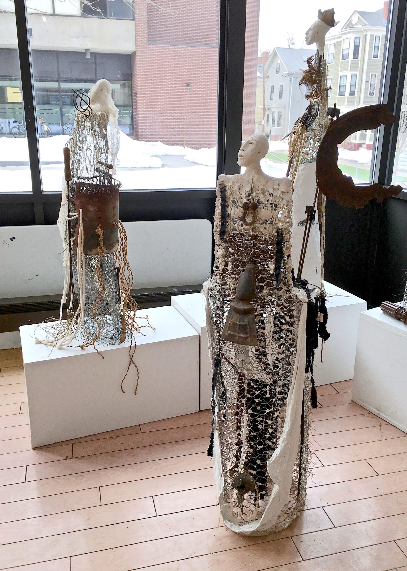 And I began to do on a regular basis, what I continue to do today: search for rusted, discarded, weathered objects or any other appealing piece of debris. All these look to me like relics. My eyes sweep the streets, the back of gas stations, construction sites, and trolley tracks. I find myself looking down at the curb to find new treasures to animate my work. Driven to push or pierce these found objects into clay and to mold clay around them, I came to realize that for me the power of the figures was activated much as it is in the tradition of the African nkisi nkonde power figures. As the object pierces the figure, the figure’s force or spirit is awakened. As found objects transform a figure, the objects themselves are transformed. What has decayed is now the agent of rebirth and is itself reborn. In 2016, I was fortunate to have Fitchburg State University’s Hammond Gallery sponsor my solo show, OUT OF RUBBLE: Women’s Voices & the Transformational Power of the Found Object.