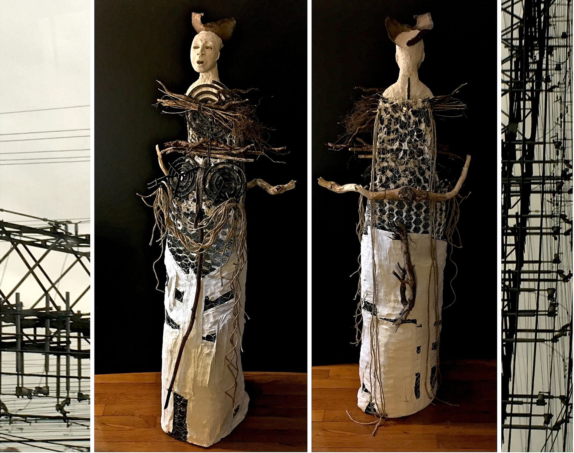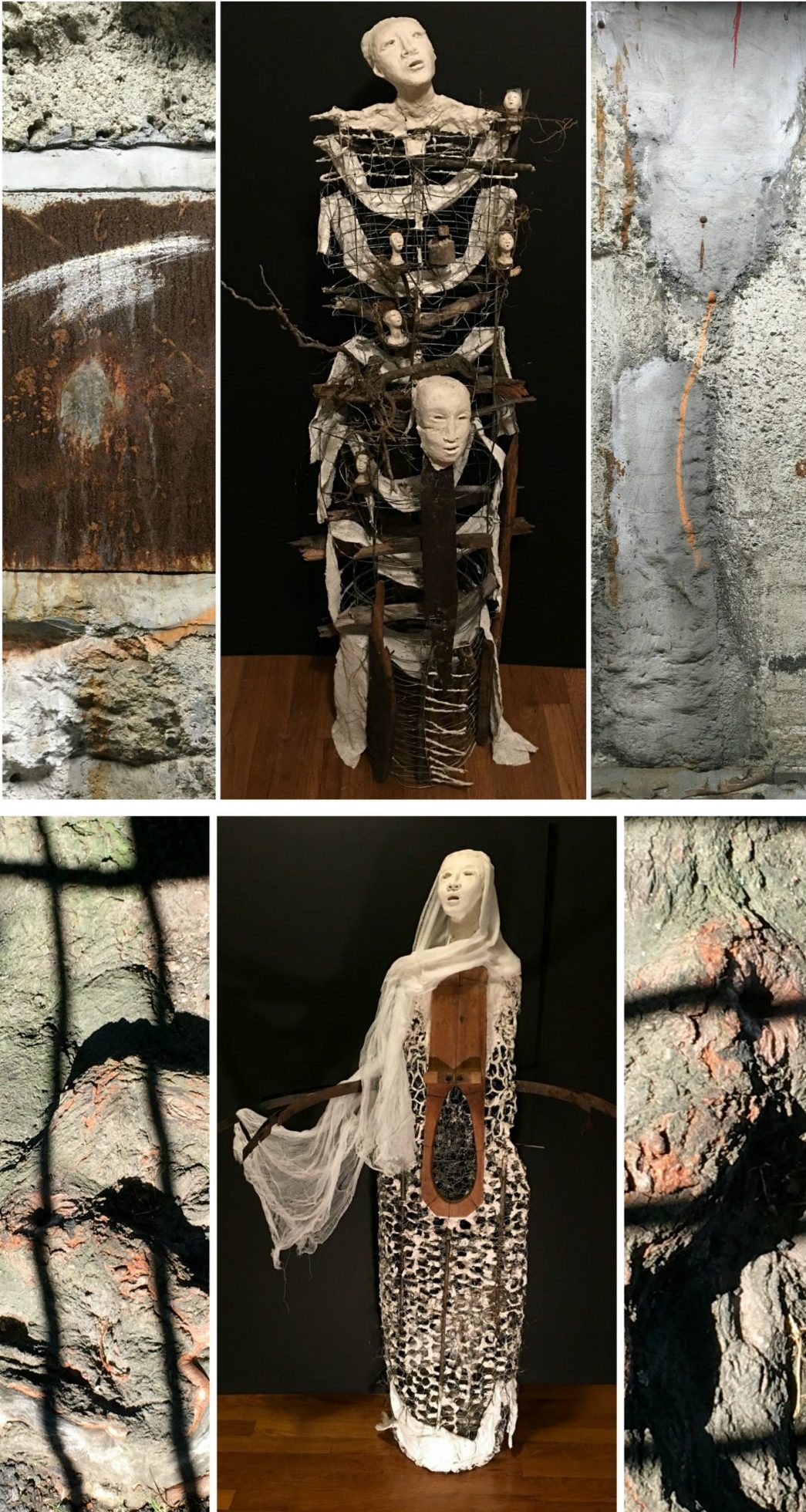These sculptures of totemic figures are born of rubble, and like the phoenix, they arise out of it. They stand as guardian figures giving voice and power to the voiceless. Alone or in chorus they chant, speak out, bear witness. They attest to what they have seen, give testimony to what they feel, to what they know. I am currently focused on my Refugee Women Series and on a series of photo collages based on images of my sculptures in settings real and imagined.