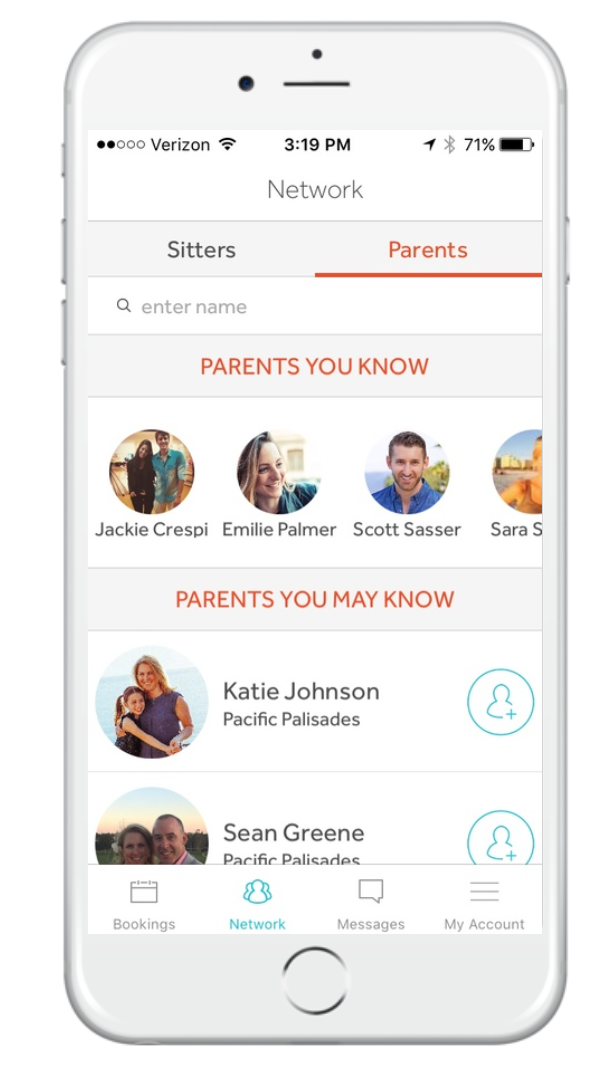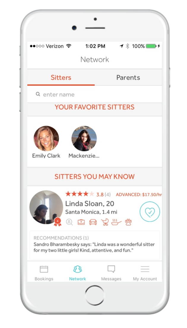 With Bambino, parents enter the start date/time, duration, and location of their job, and then they select which sitters they want to send their request to. Sitters are organized based on who you know, who your friends know, and then by distance, so in essence, you’re selecting from sitters that have been babysitting for your friends and neighbors. Every sitter has to log in with Facebook, and they have to have a recommendation from someone in their community.