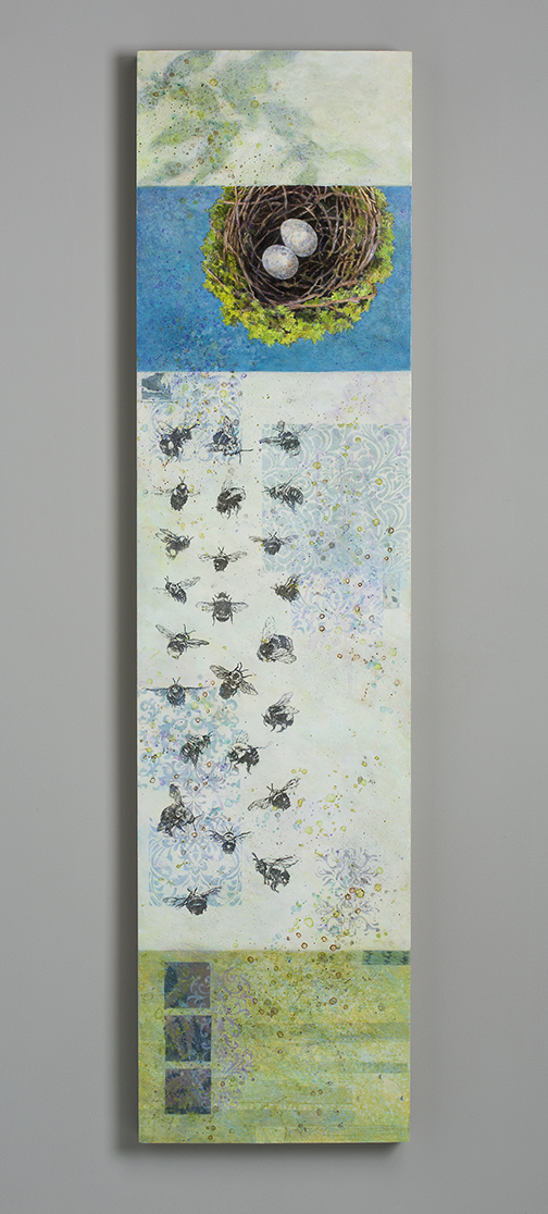My work is about collecting and a life-long passion for objects found in the natural world, my source of sanctuary, wonder, and personal rhythm. Birds, wildflowers and insects rendered in extensive detail, are set within layered histories of surface pattern. They have become personal icons, representing themes of vulnerability, transformation, and survival.