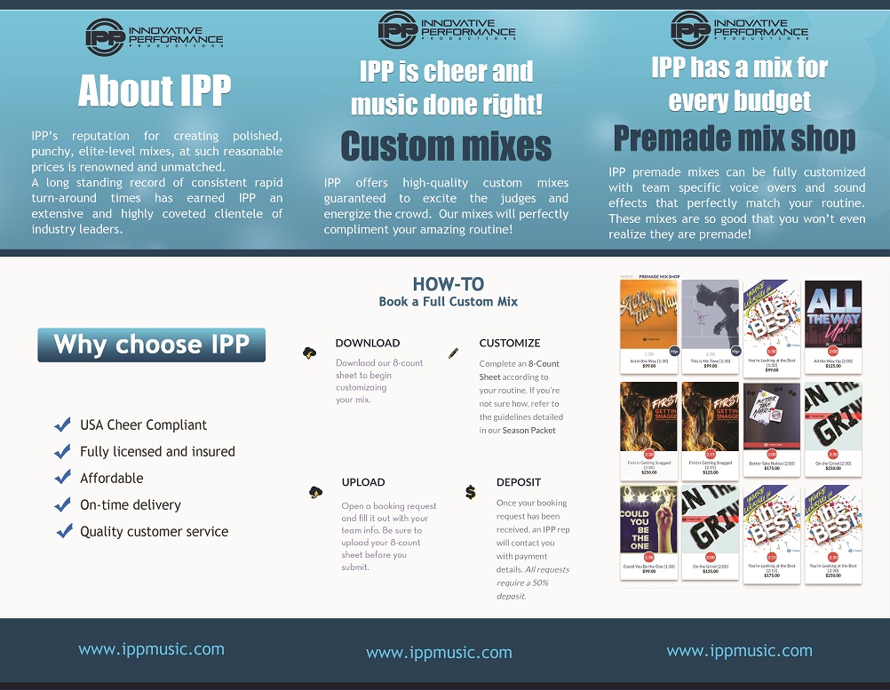 Innovative Performance Productions (IPP) specializes in the productions of performance music for cheerleading and dance. We offer both custom and premade products which allows us to service a large range of clients from local pop warner programs to highly competitive all-star and college teams from around the world. We are known for having an extremely high-quality product at affordable prices. We have amazing customer service and a staff that can handle any challenge while staying on pace and delivering products on-time. On a business level I am very proud of the services we offer and how efficient our process has become. Our website has made us able to seamlessly handle 100s of requests daily. This gives us a great advantage because we don’t miss any potential orders. On a personal/employee level, I am extremely proud of how each department can handle their work load and work together behind the scenes to be able to handle massive amount of orders, emails, phone call act. which enables us to be able to keep our promises to customers and deliver daily. Each employee has a specific job but must work with other to complete daily tasks and this is done perfectly from top down and bottom up. What sets apart from other is our ability to handle 100s and 100s of orders and delivery on-time, high-quality products instantly. We have built our reputation on our process and it keeps on getting better.