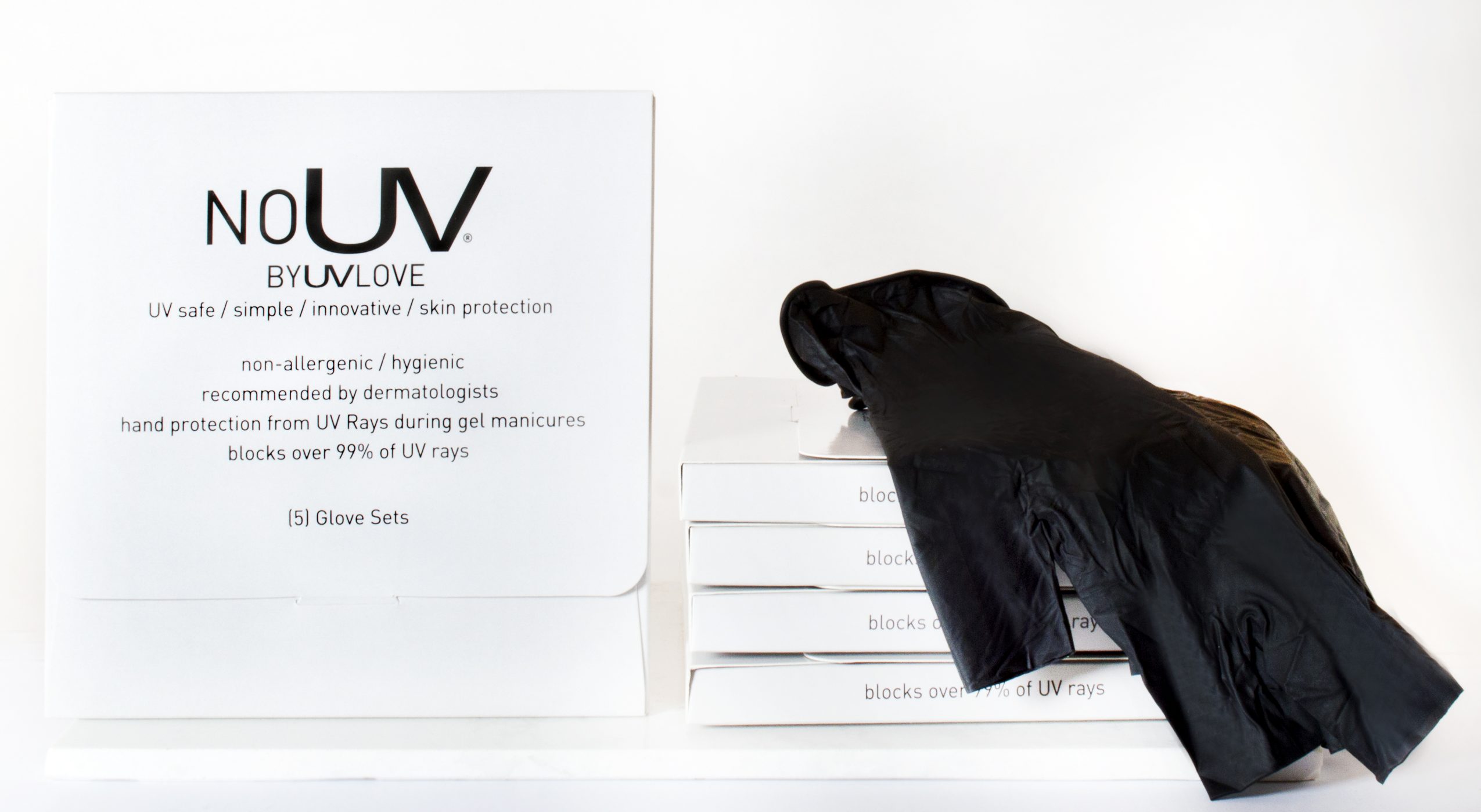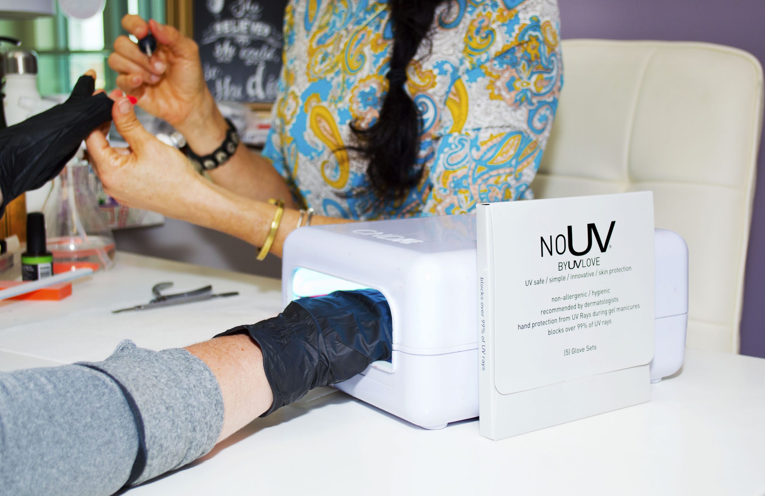 I started using sunscreen on my hands and found it to be messy and couldn’t help but think that my wet sunscreen soaked hands were picking up bacteria that was already in the UV lamp…yuck! So, I then bought a pair of cotton gloves online and wore them a few times before realizing that they shrank when I washed them, or I’d forget to wash them or put them in my handbag and end up in the salon without them. Again, annoying! I wanted an answer, a hygienic way to protect my hands during every gel manicure, so NoUV was born!