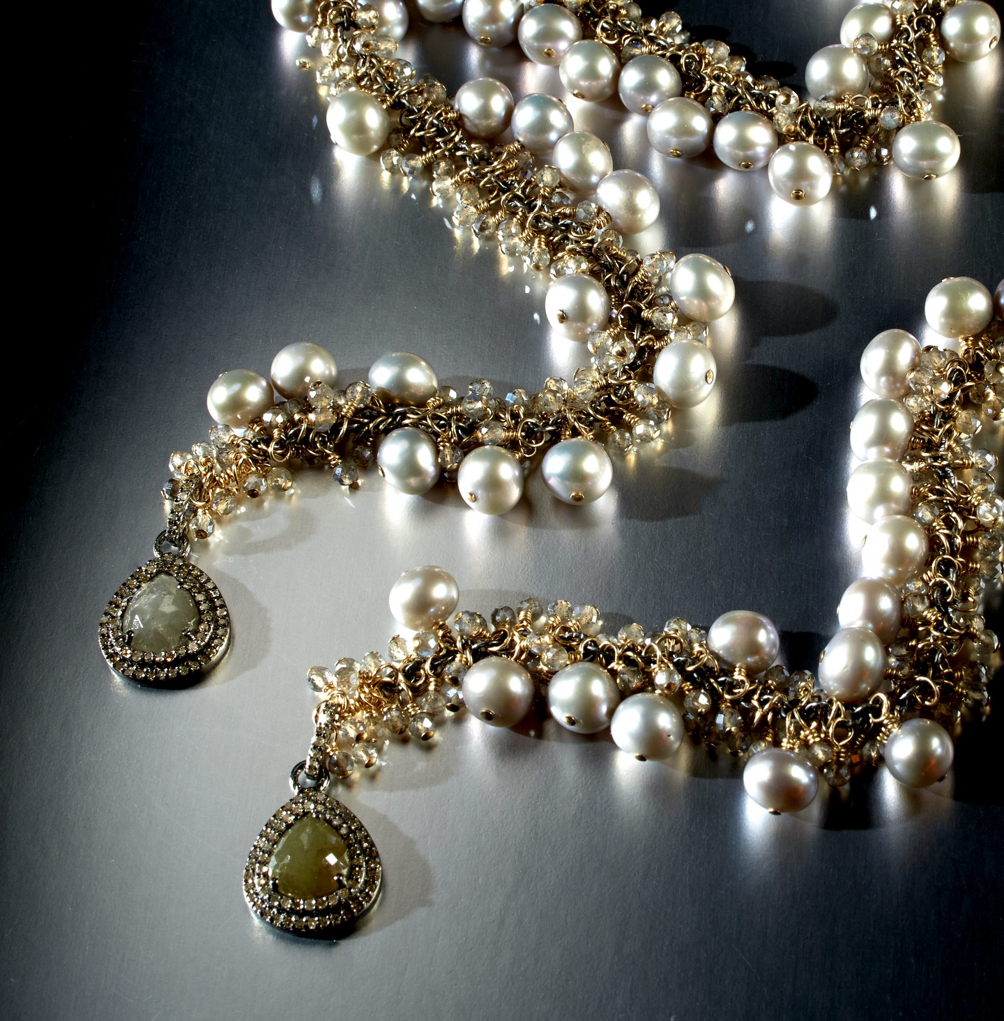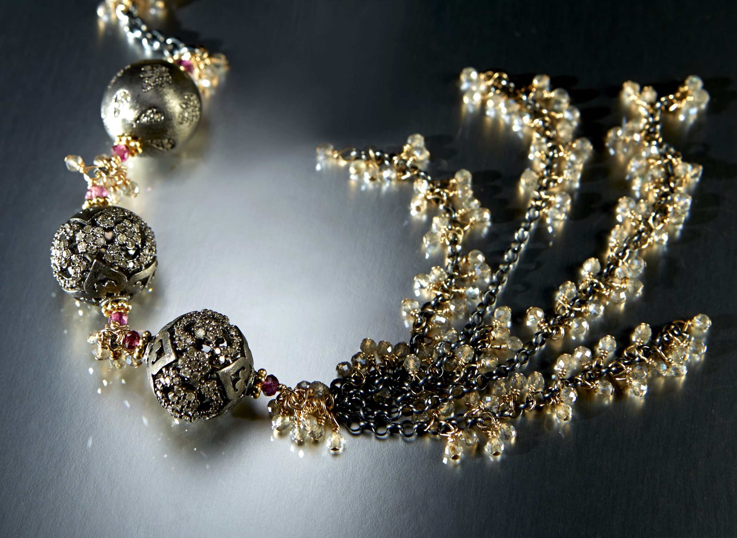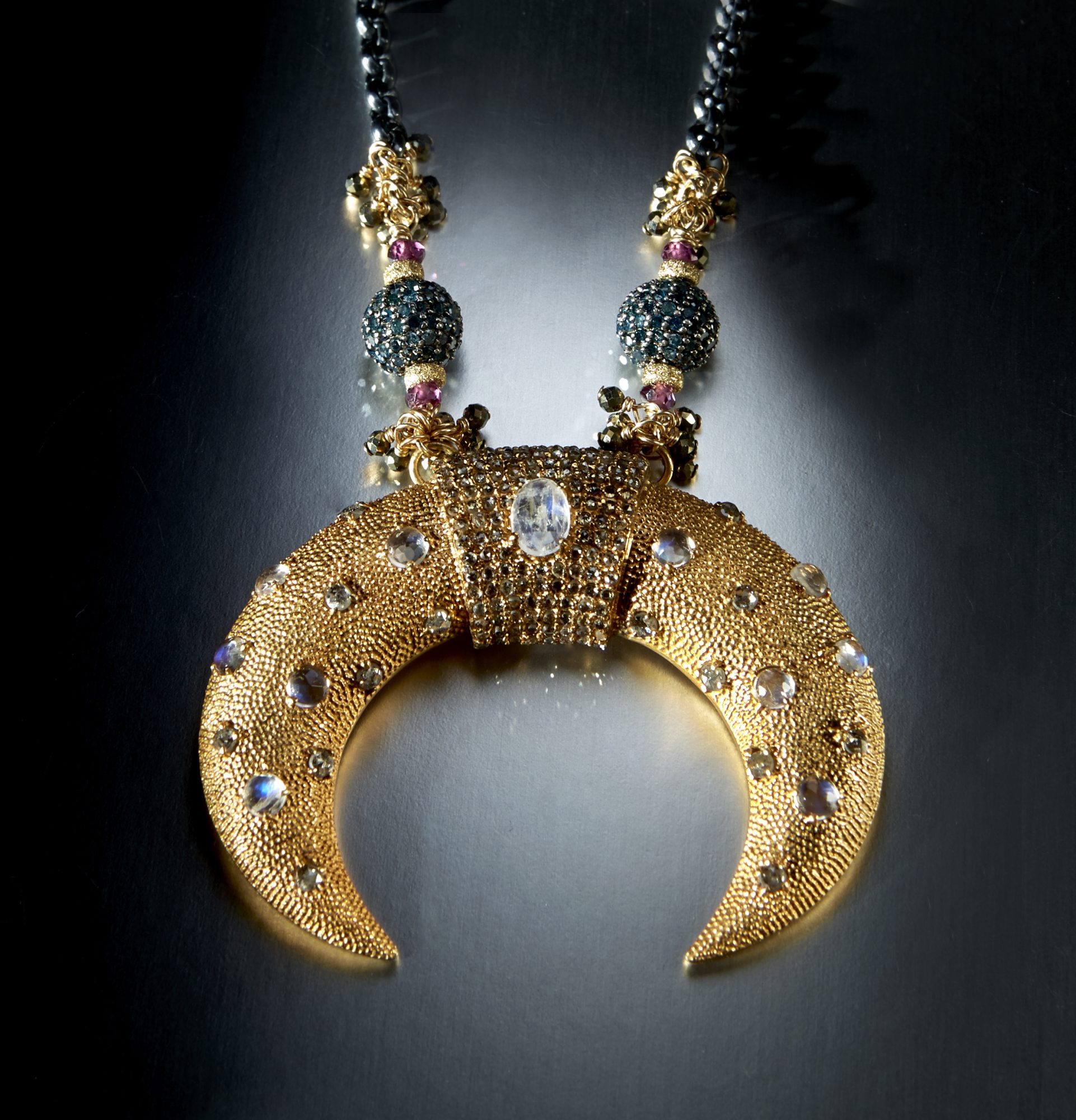 I remember siting on the floor and making the necklace. I never took a jewelry class in my life (up until today and I bought jewelry magazines to try to teach myself hope to do them. I fell in love with the art of design, and my husband, who told me to take sis month to see what I can do with it. I have been designing for 13 years. I sold to Bloomingdale and now I sell to Neiman Marcus and other jewelry stores.