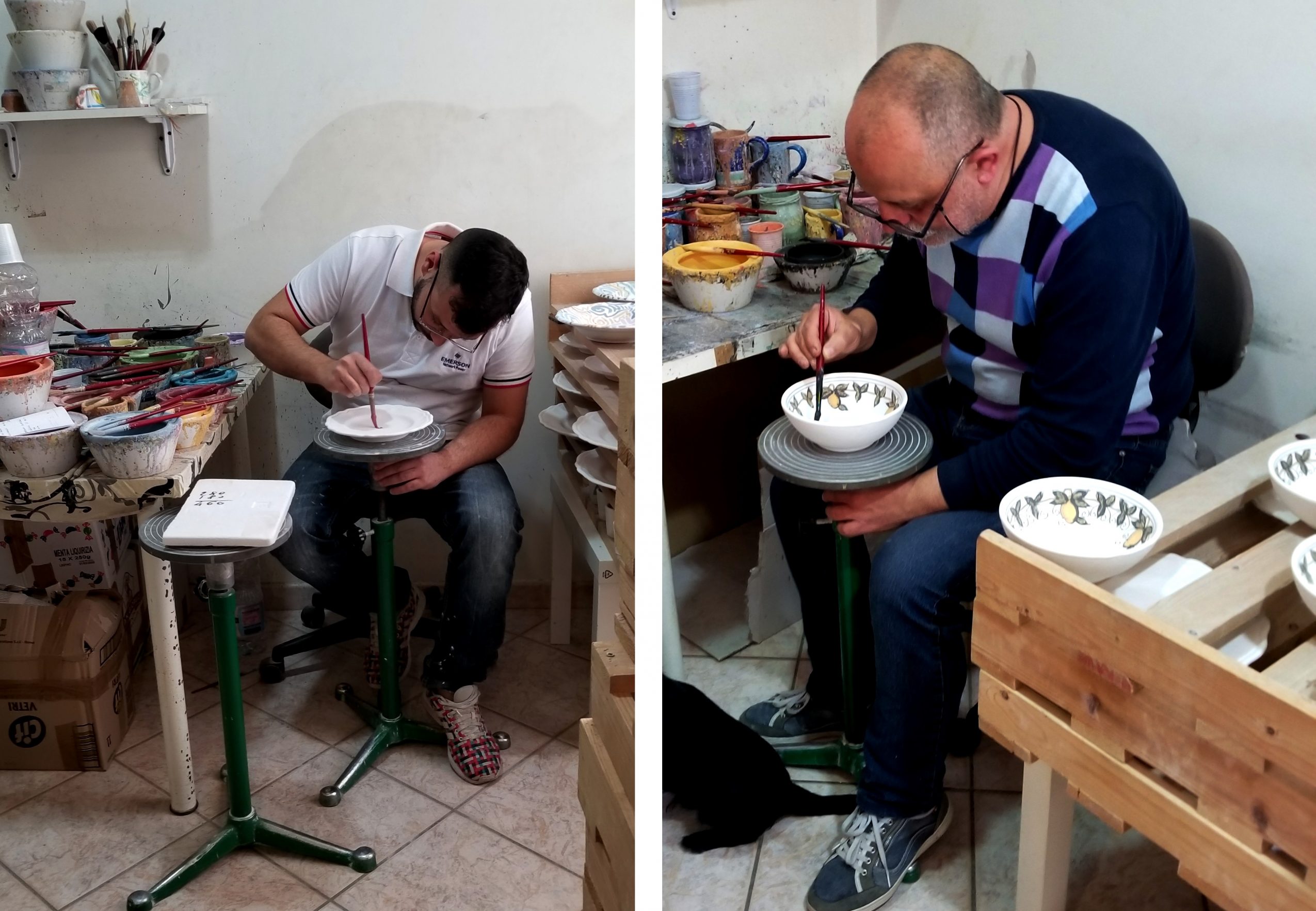 I flew to Rome in 2011 to finalize our business plan and to travel south to meet the artisans that produced all of the wonderful things I was seeing on photos. It was a whirlwind 2 weeks of traveling the Amalfi Coast, with stops in to meet each artist that specialized in a certain n design or style of painting. All of the artists we met with worked in their own studio, many were “generational” artisans, working alongside their father or mother or other family relatives and keeping the craft of hand painted ceramic art alive and well in southern Italy.