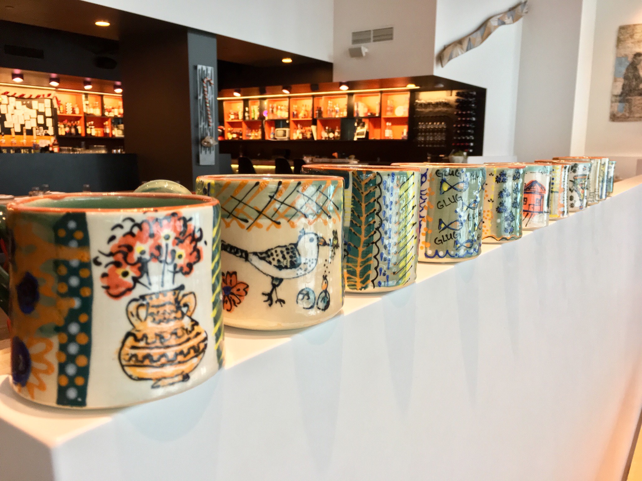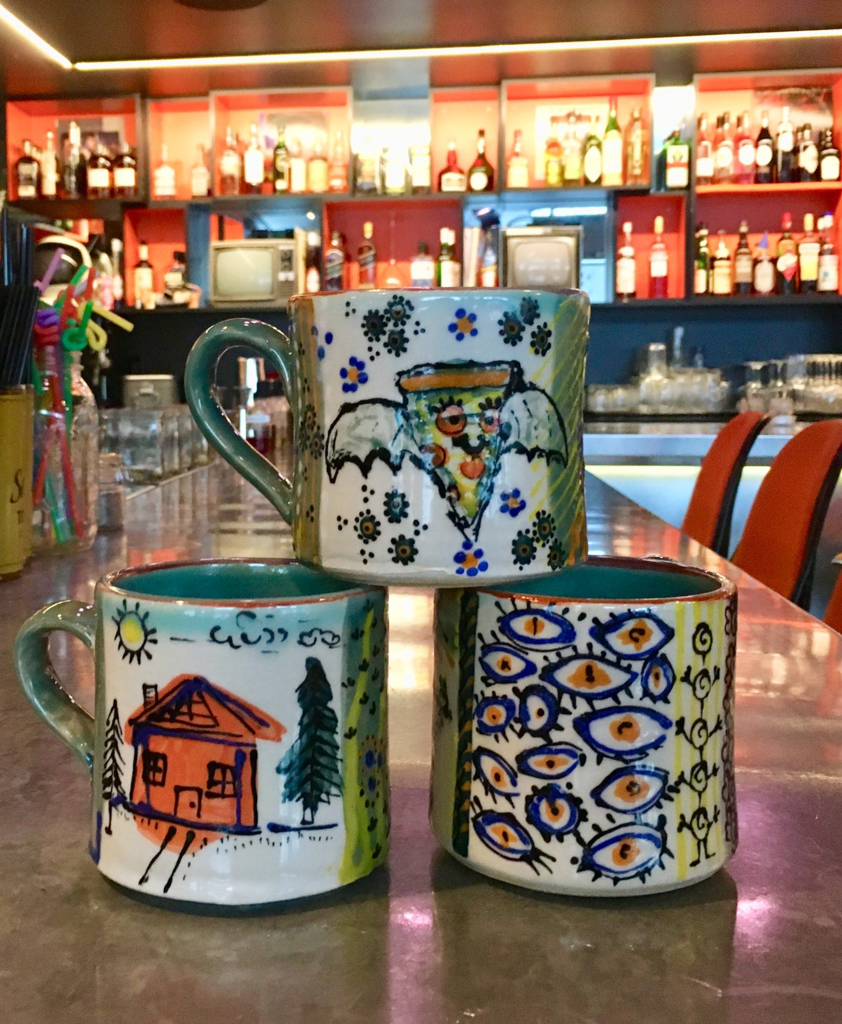 I recently did a commission for the restaurant Area Four in the South End. I was asked to make a set of mugs but was given the freedom to decorate them as I pleased. I wanted to make the mugs look as fun as the restaurant they were going into. The restaurant is decorated with records, old tvs, lava lamps, board games, and even Barbie dolls as drink garnishes. I went back to that child-like mindset and covered the mugs in exciting patterns, weird characters, and drips of colors.