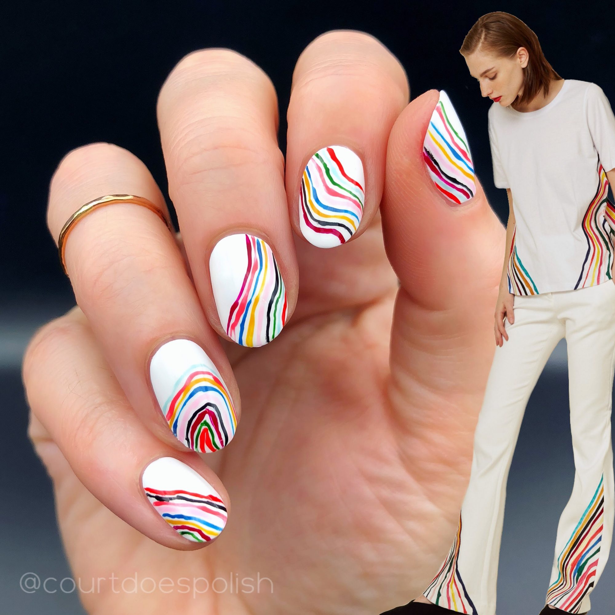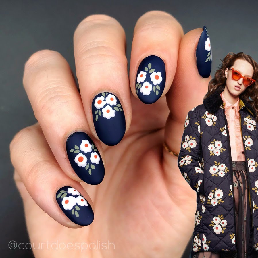 I’m super inspired by fashion. I love combing through the Vogue Runway app to look through the latest collections from established and up and coming designers and trying to figure out what I could replicate on my nails. In my posts, I’ll not only show the nail art, but I’ll also feature the runway look that it was inspired by. Lately, I’ve also been really into floral patterns, I think because they’re super trendy right now, even outside of nail art. It seems like anything I do that has a flower in it, whether it’s an abstract pattern, or a super detailed Rifle Paper Co inspired pattern, has performed really well, and generally those are the most challenging to replicate, so I’ve been really proud of how my work turned out with some of those looks. I look at a lot of things – art, fashion, graphic design, nature – and wonder what it would look like on my nails.