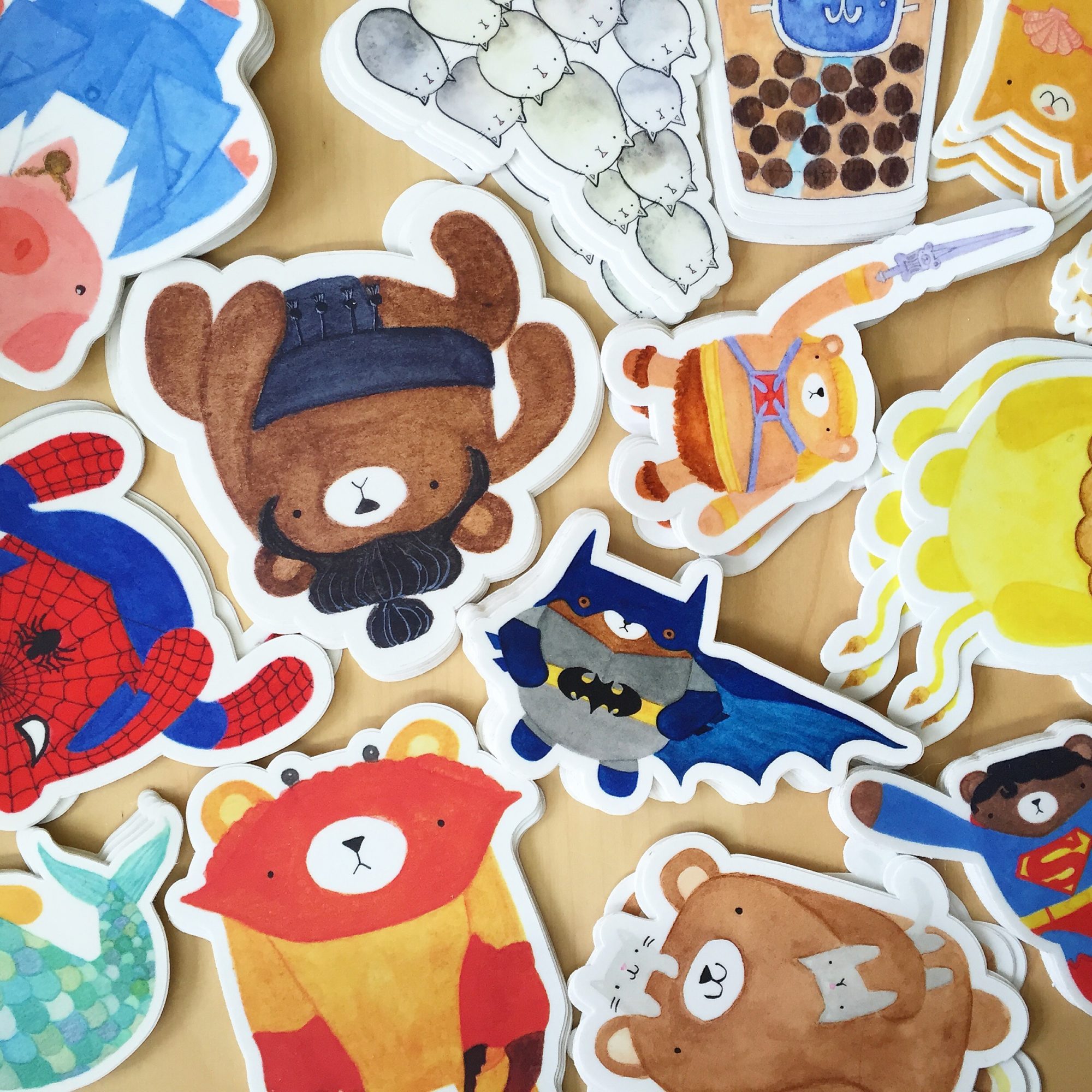 Now, most of my sewn accessories feature animals or food and most of them have faced. Many of them are intricate, with lots of little pieces. I also started making larger sewn art pieces. Along the way, I started drawing and painting more of these characters and have expanded my product line to include paper and home goods that feature my paintings and illustrations as well.