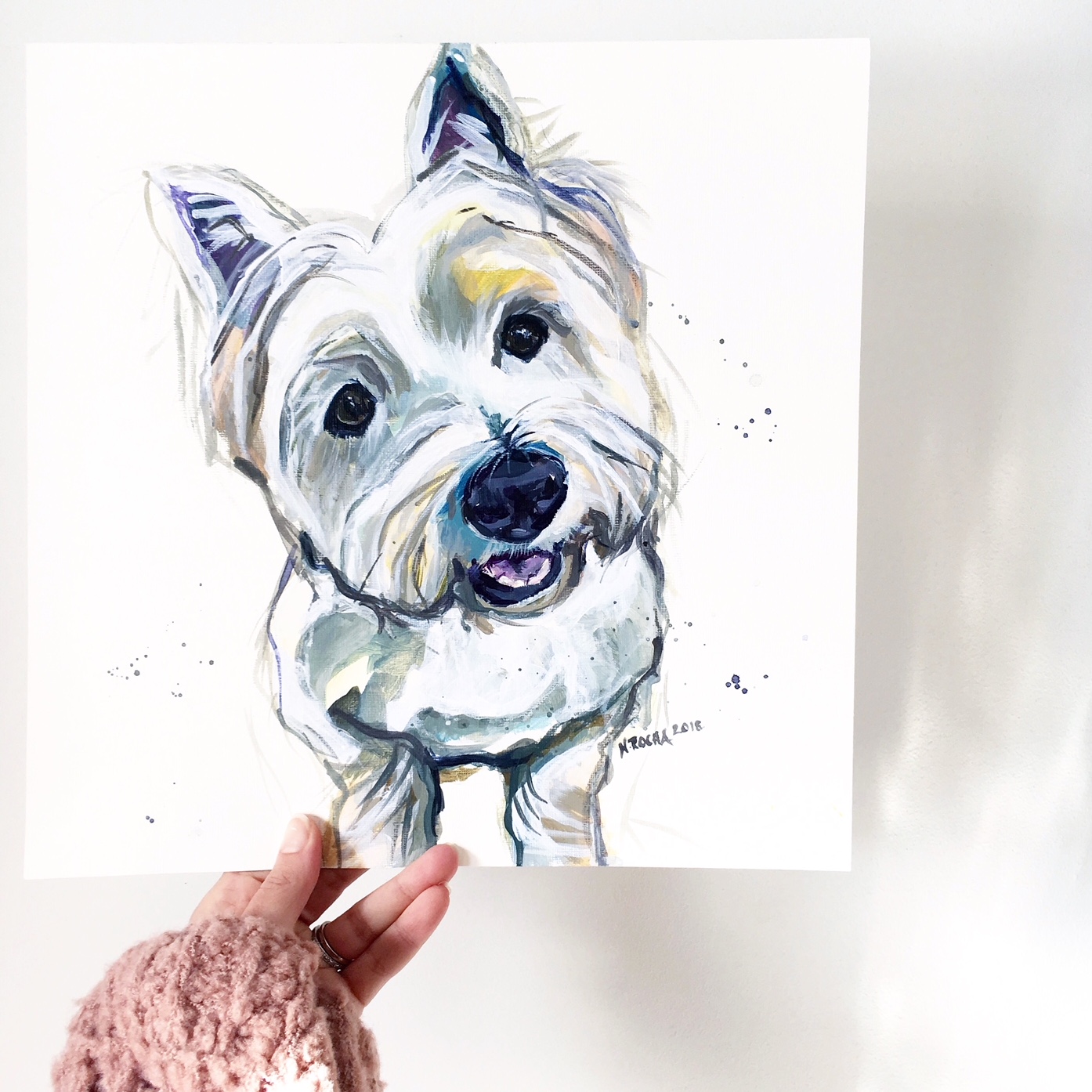 I am an artist that specializes in creating custom artwork for my clients. Whether it be invitations or portraits, I am here to translate your ideas into art! I love working with all types of mediums such as acrylics, watercolors, gouache or even printmaking inks. One of my most popular requests is pet portraits. I think what sets me apart from others are my unique color choices. I get so excited to see what colors come through a photograph and then figuring out how to make that color. For example, It could be a black lab, but instead of seeing black, I usually end up seeing a variation of blues, depending on the lighting of the photograph. Sometimes greens, sometimes red. That is probably my best strength when I paint. I am most proud of my business when I am able to touch someone’s life through my artwork.