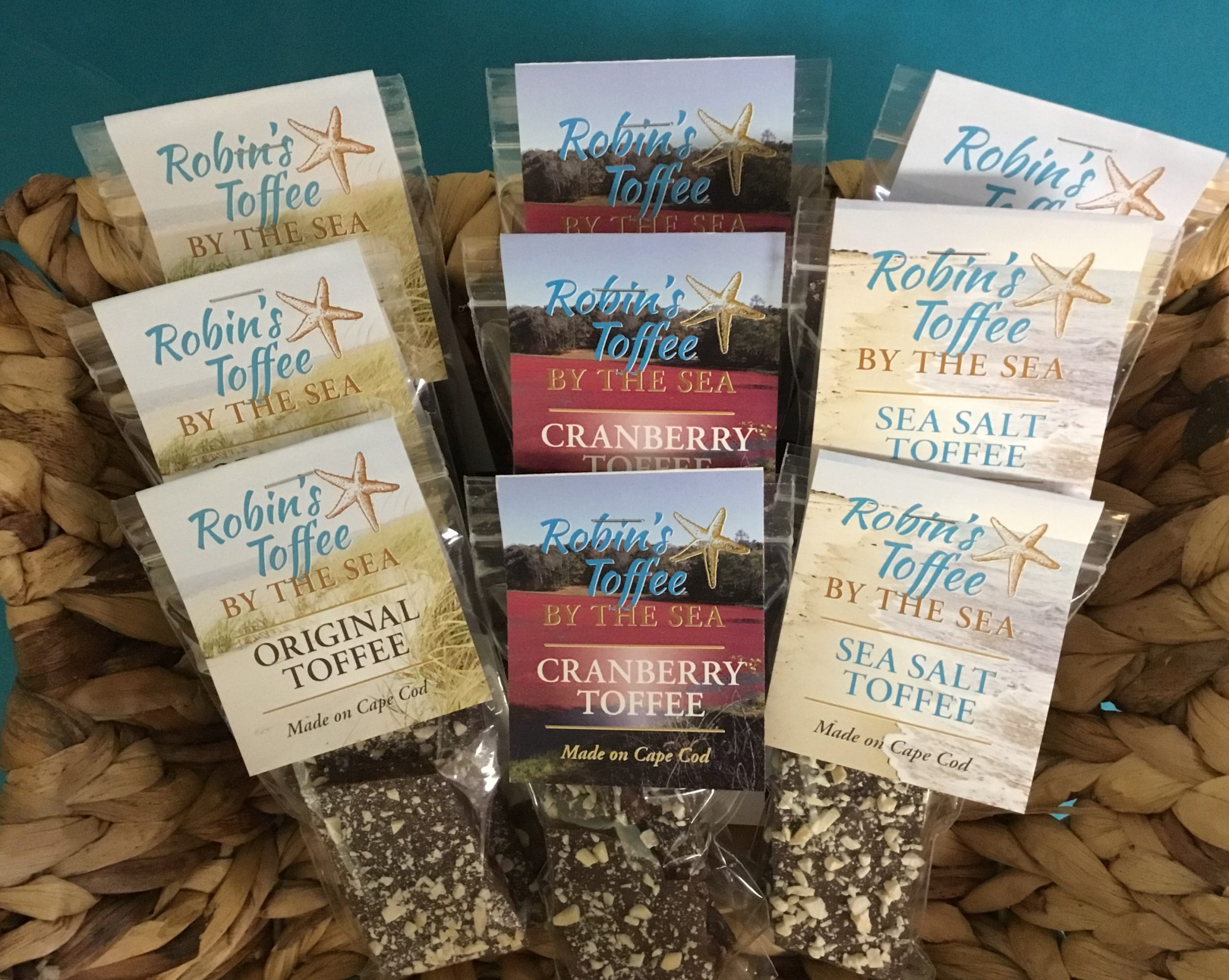 I have made toffee for many years as a holiday tradition for family and friends and was always told how “deliciously addictive” it was! My recipe originated from family and was always made in small batches and this continues today. As my husband and I started to think about moving to the cape full time, I began to think about what I wanted to do to keep myself busy which is what prompted me to think about starting my own business but doing something fun and that I enjoy. In 2014 I began to test the product at local venues to see how it was received. Immediately the response was overwhelming, and I was asked what else can I do? That is how the flavors evolved, and I now offer sea salt, cranberry, coconut, peanut butter, chili pepper, and peppermint (holiday offering). I also private label for Cape Cod Beer located in Hyannis making their Ale House Toffee as well as Cape Cod Coffee located in Mashpee making a Vienna Roasted Coffee Toffee. I enjoy trying new ideas and my latest product offering is a Sea Salt Toffee Trail Mix made with my dark sea salt toffee. I also do custom favors for various events such as weddings, showers, birthdays, and other special gifts.