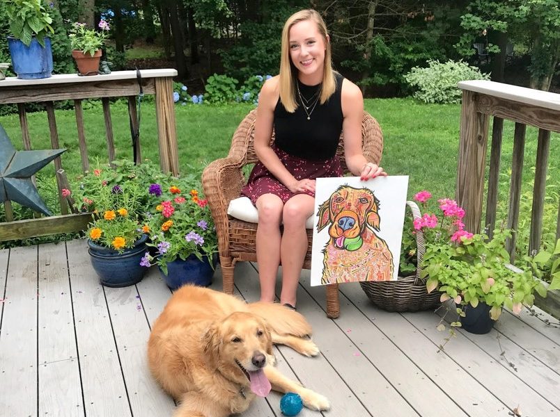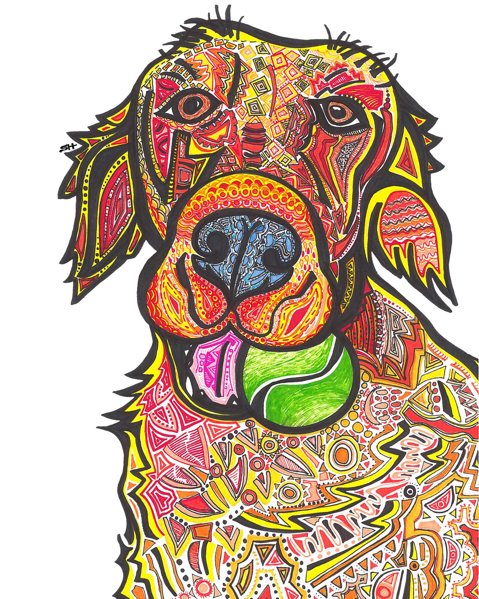 My art has always come from the heart. When I design a new piece I essentially turn off my brain and just draw. I fill my drawings with colorful shapes and colors to make my work happy and exciting because my main goal as an artist is to spread joy and happiness. If my art makes you smile as your sitting at your desk at work, then I have done my job. Most of my work contains no background or foreground but rather focuses on the subject matter itself, with intricate designs and color patterns making up its features. Being an English major in college also developed my love for puns and wordplay, which is why you will see a lot of my drawings include fun sayings and captions. I draw subjects ranging from alcohol prints to baby prints, and everything in between but I have really found a niche in doing custom pet portraits. My goal with custom pet portraits is to highlight each pet’s unique features and truly make it something special for the recipient of the artwork. Customers can request their pet’s name or any other customization that they wish and can get it printed on any of the products I offer ranging from greeting cards to apparel and even tote bags. The biggest thing I would say that sets me apart from others is my unique style. I have been told by many people that my work is very different from anything they’ve seen before, and I really appreciate that!