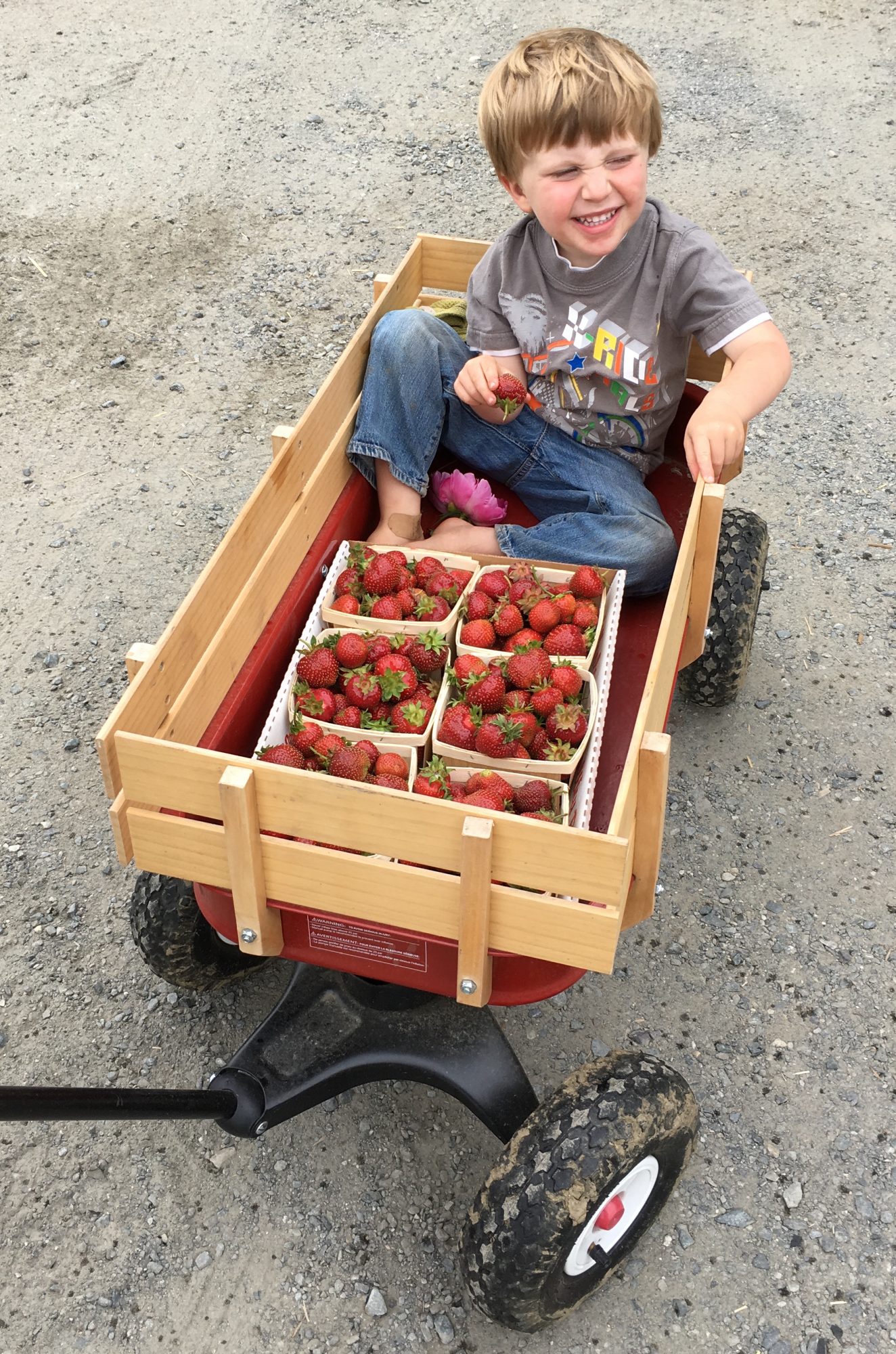 Strawberries are the crop that Upinngil has been known for the longest. As kids we worked in the strawberry fields with our father, riding the transplanter, picking blossoms (you do this the first year to get the plants established), hoeing, weeding, and finally picking the fruit and peddling it around the county. Now that we are established, we sell about half the crop pick-your-own, and the other half on our farm stand, rarely needing to deliver to other markets.